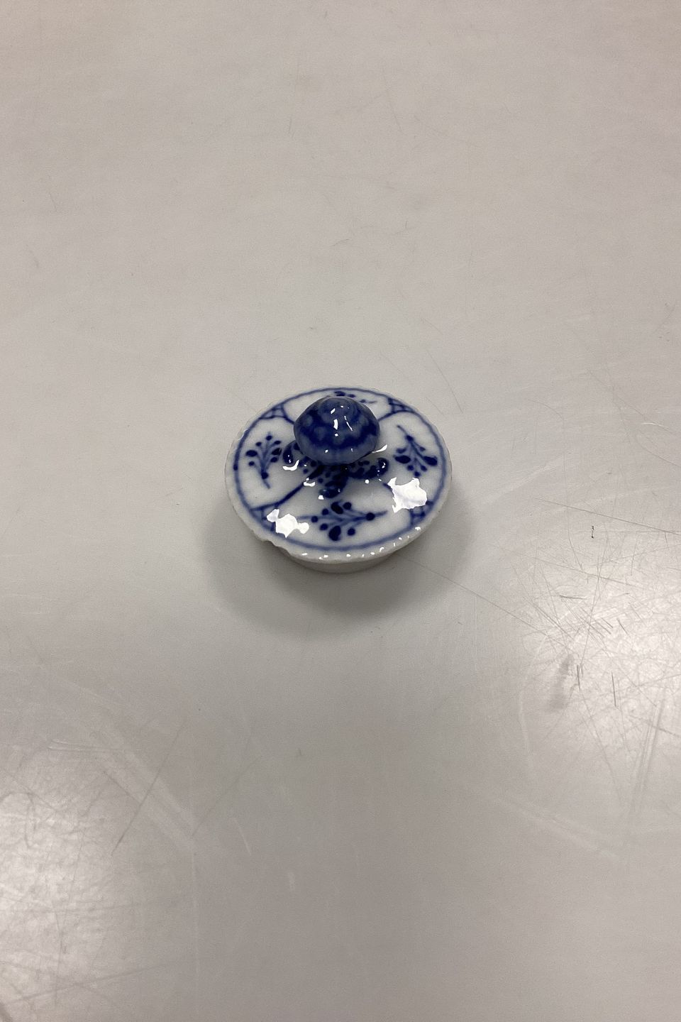 Royal Copenhagen Blue Fluted Plain Lid for Teapot No. 247. Chip on the edge of the lid, see photo.Measurements: Inner diameter approx. 3 cm / 1.18 in. Outer diameter approx. 4.4 cm / 1.73 in.