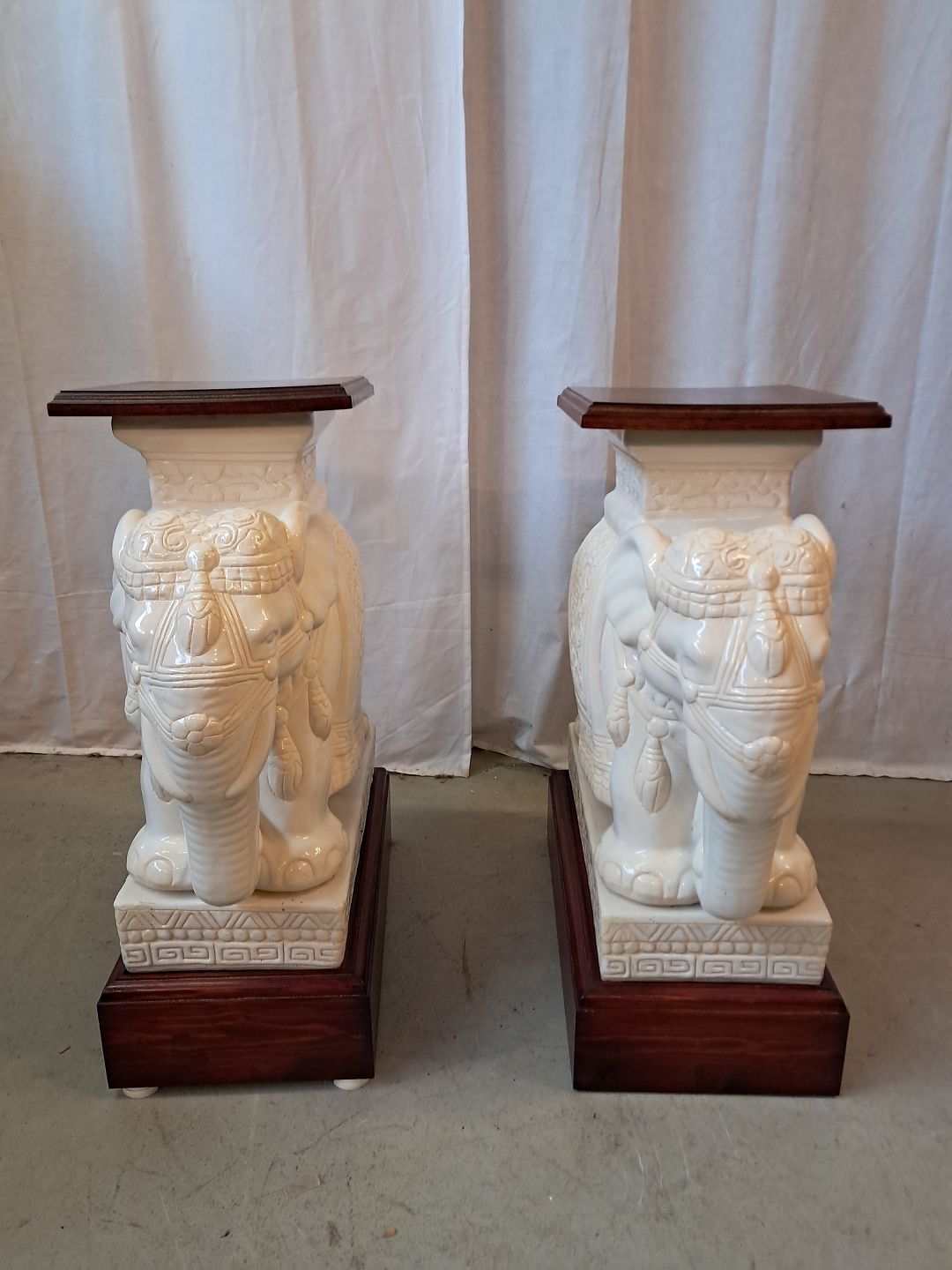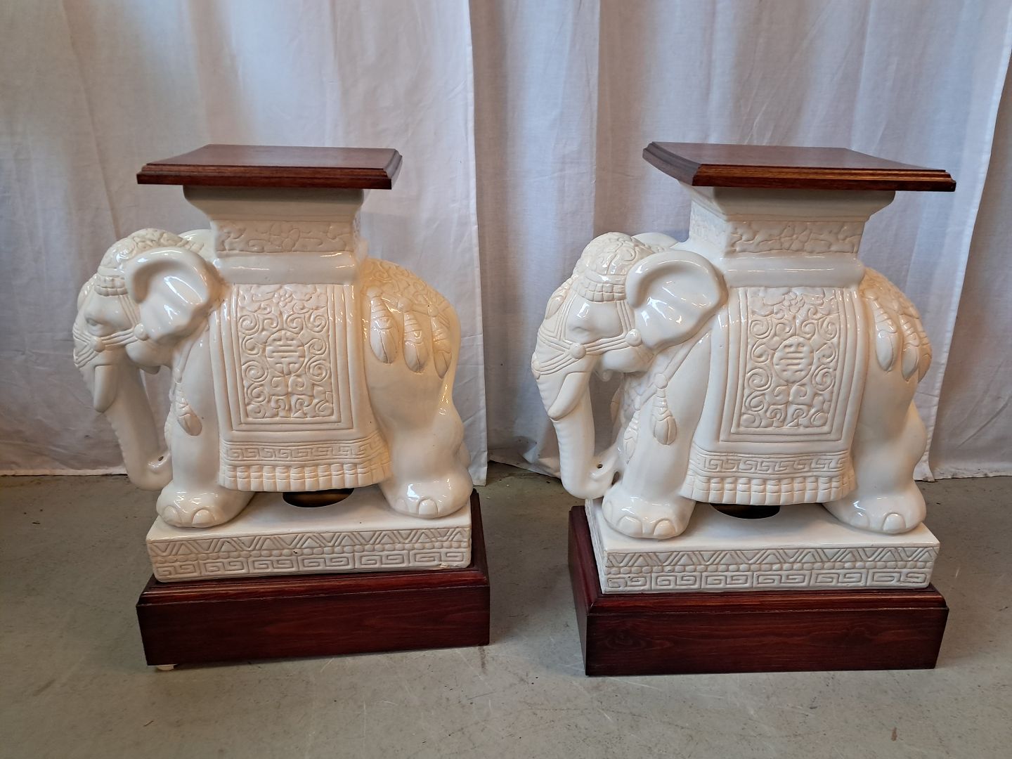2 Pocelæns-elefanter med træsokkel og topplade, fra 2000erne.Højde 66cm Bredde 26cm Længde 47cm