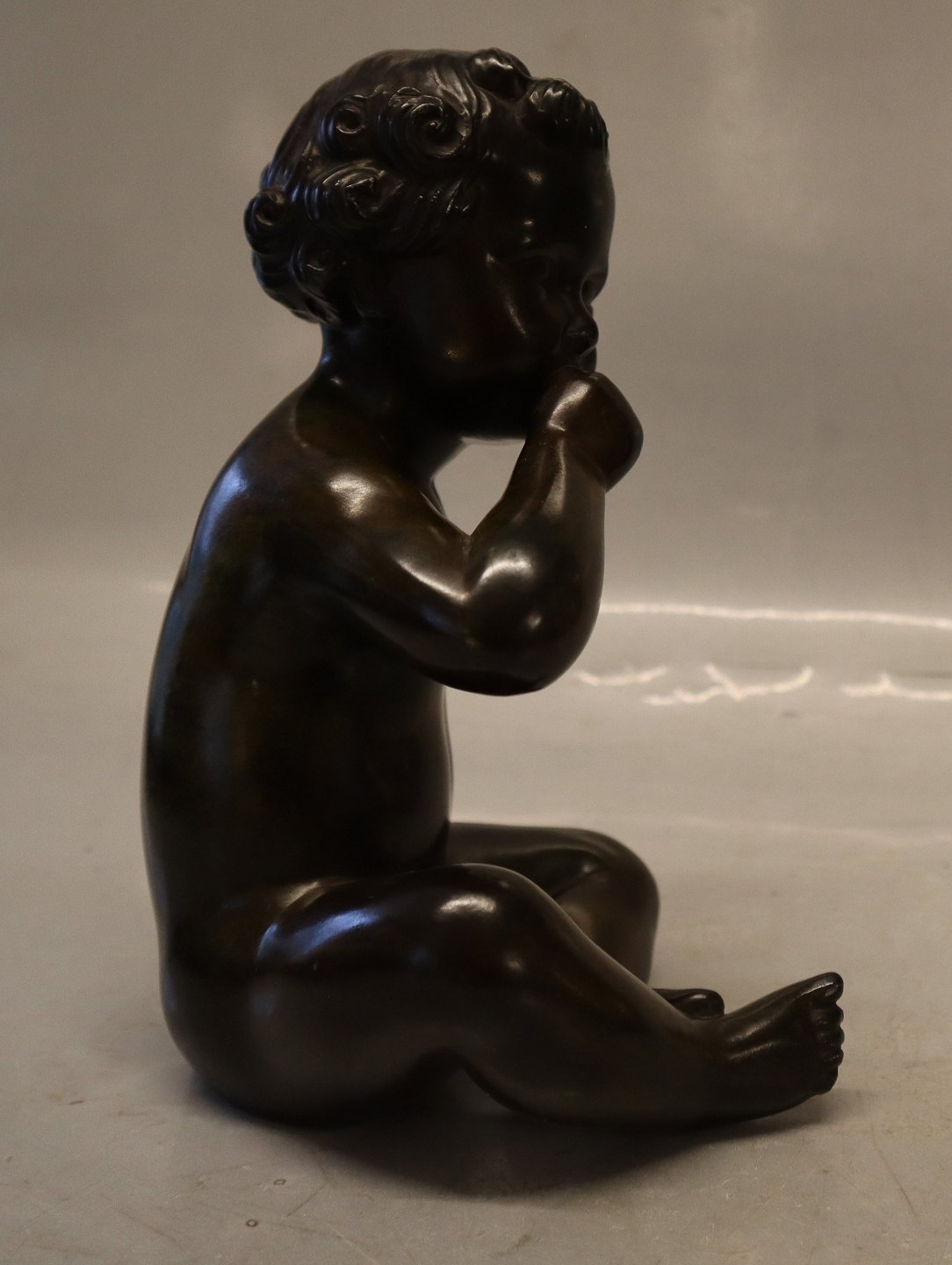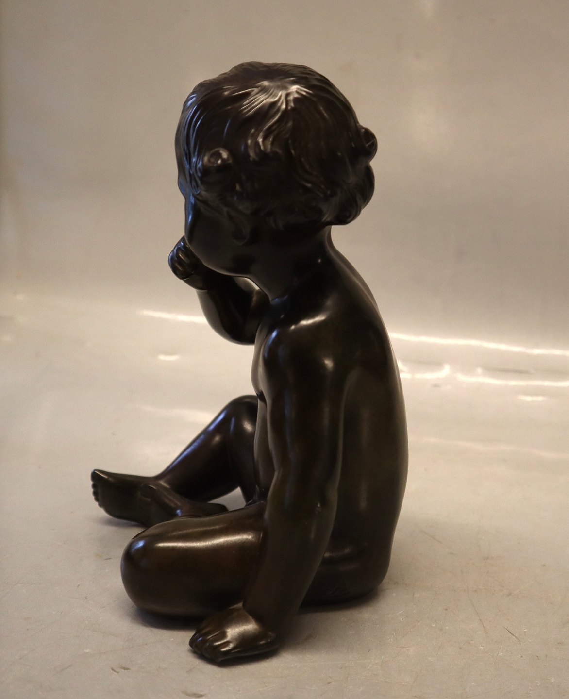 Just A Disko D 2323 Boy sitting sucking thump 19.5 cm Bronzed sculptureIb Just Andersen (1884-1943) sculptor and silver smith. In his early carrier he was designing jewelry for A. Michelsen and P. Hertz. He continued a lifelong production of silver and gold jewelry. But he is best known for his neoclassic Scandinavian design of article for everyday use in pewter, brass, copper, bronze and Disko. Disko Metal is an alloy of lead and antimony, which was Andersen's own invention and named after the Disko Bay of Greenland, where he grew up. It was used to produce "Bronze" items, such as candlesticks, vases, sculptures for common people and also for models in the foundry, because it was cheaper than real bronze. After being cast the pieces were patinated as bronze, copper or brass. Just Andersen had his own show rooms in Berlin, London, New York and Los Angeles