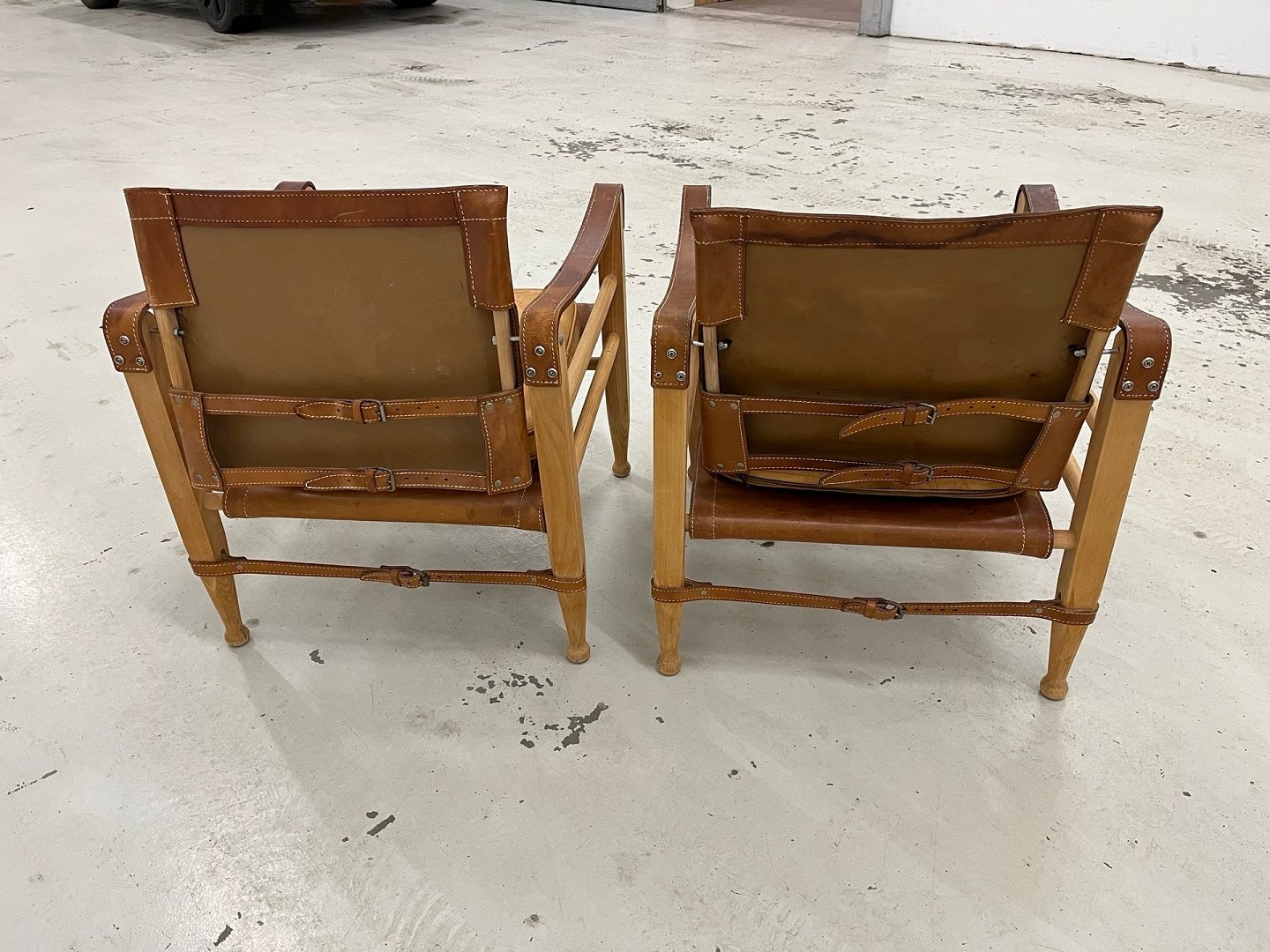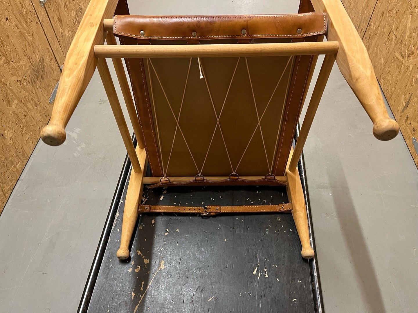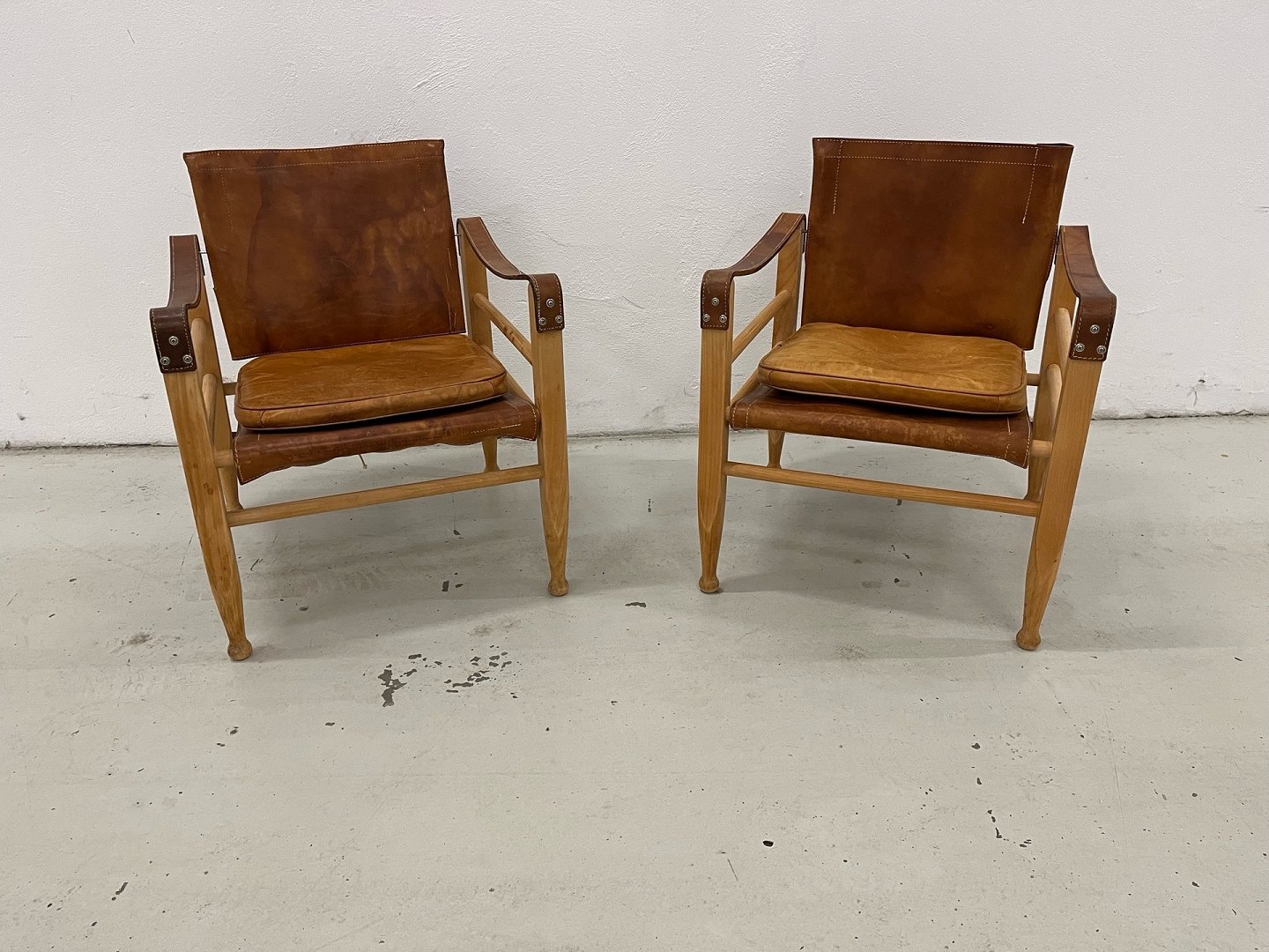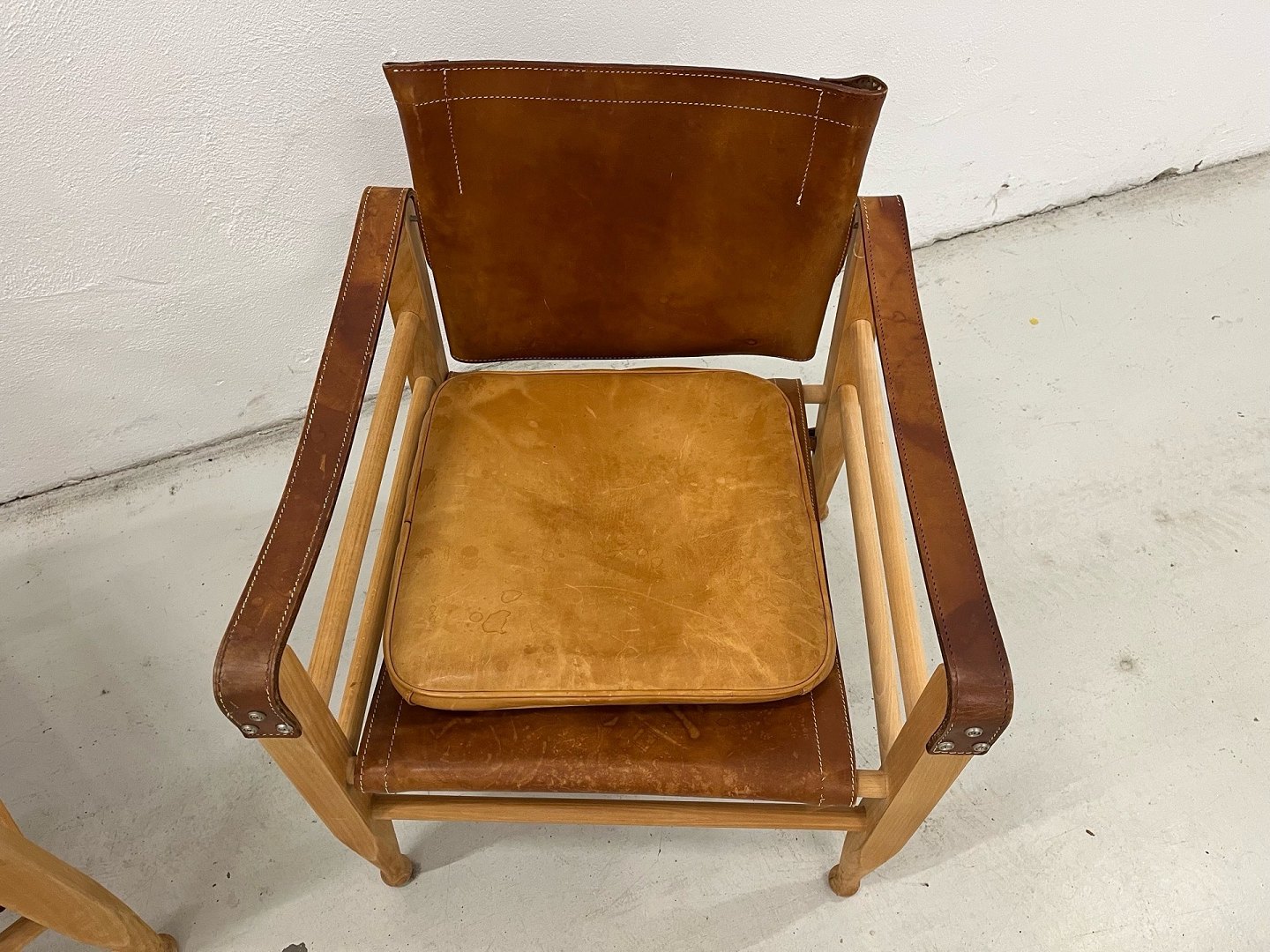 Aage Bruun & Søn - Safari chairs, 1960sA completely unique and exceptionally well-preserved set of safari chairs designed by Aage Bruun & Søn from the 1960s. The chairs are made with a solid beech frame and seat, back and armrests in cognac-colored, patinated grain leather. The leather appears beautifully patinated, and both buckles, straps and frames are in completely original and flawless condition. The chairs have had one owner since new and come from a smoke- and pet-free home. The set comes complete with original leather sofa and cushion.Dimensions:Height: 67 cm � Width: 55 cm � Depth: 57 cm � Seat height: 36 cm