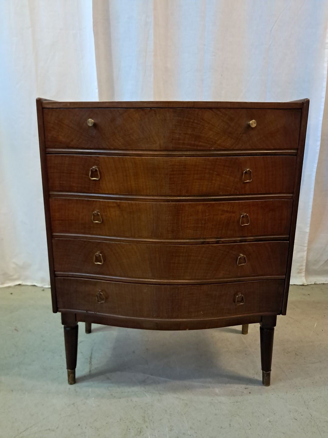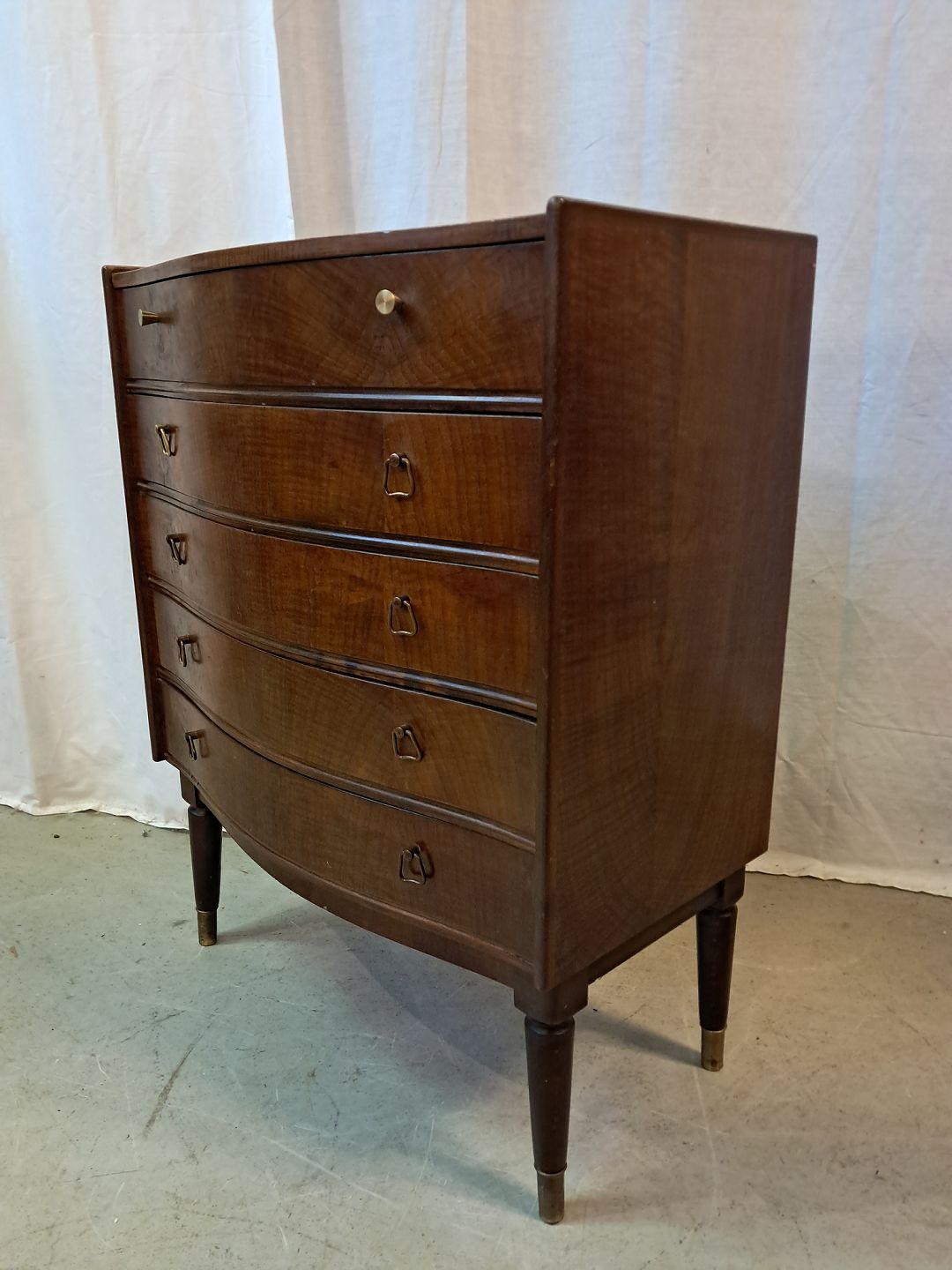 Kommode i fineret nødetræ, fra 1950erne.Den har brugsspor.