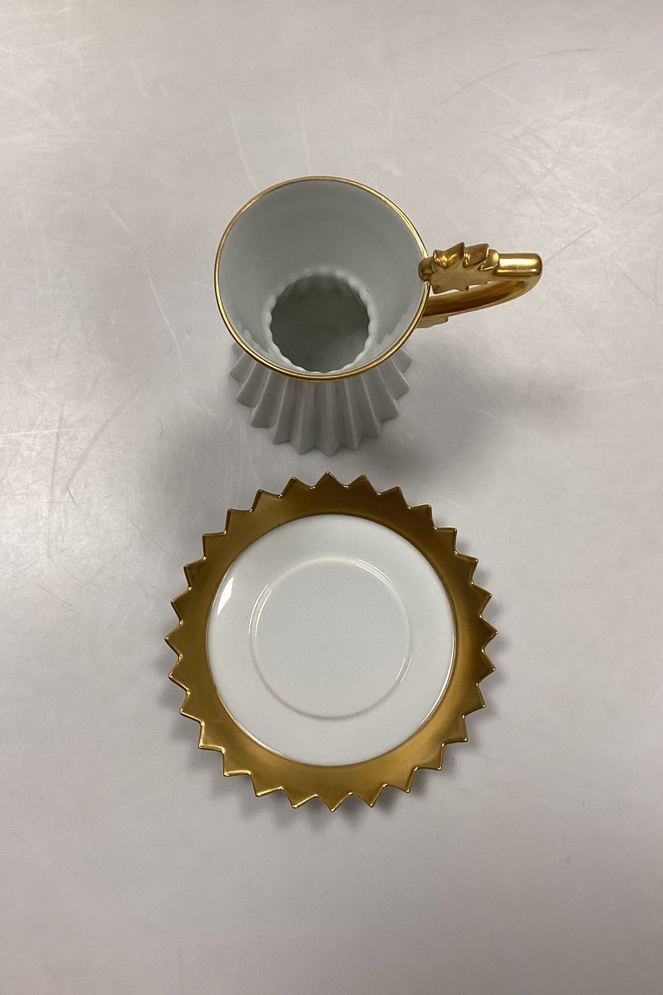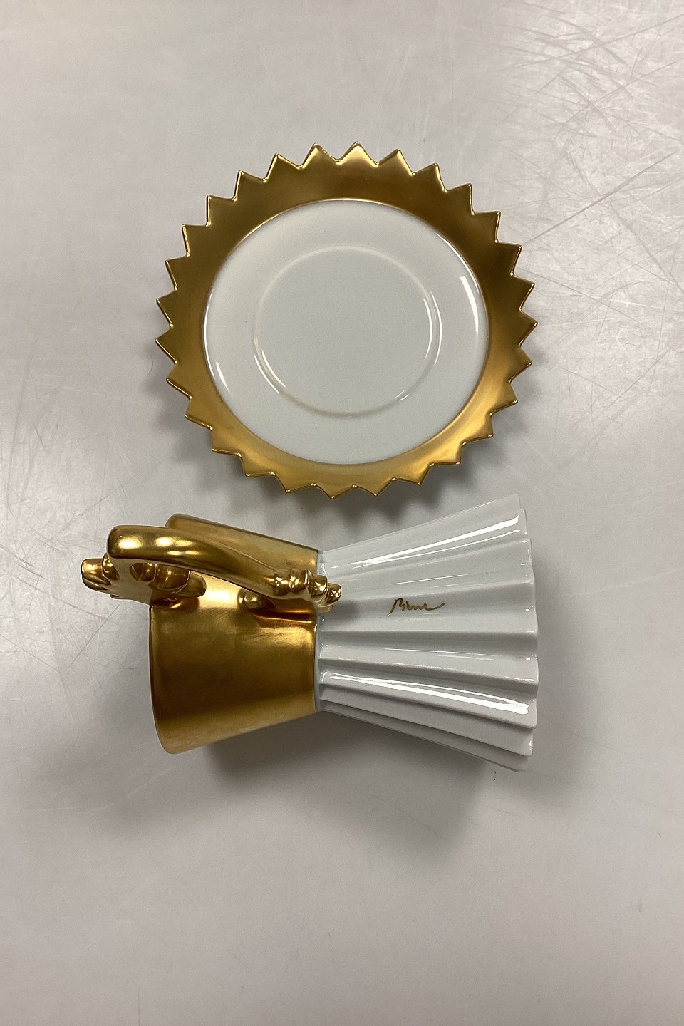 Rosenthal Studio-Line Artist Cup No. 23. Designed and signed by Otto Piene. Made of white porcelain with gold decoration.Dimensions: Cup 11 cm / 4.33 in. Saucer 14 cm / 5.51 in.