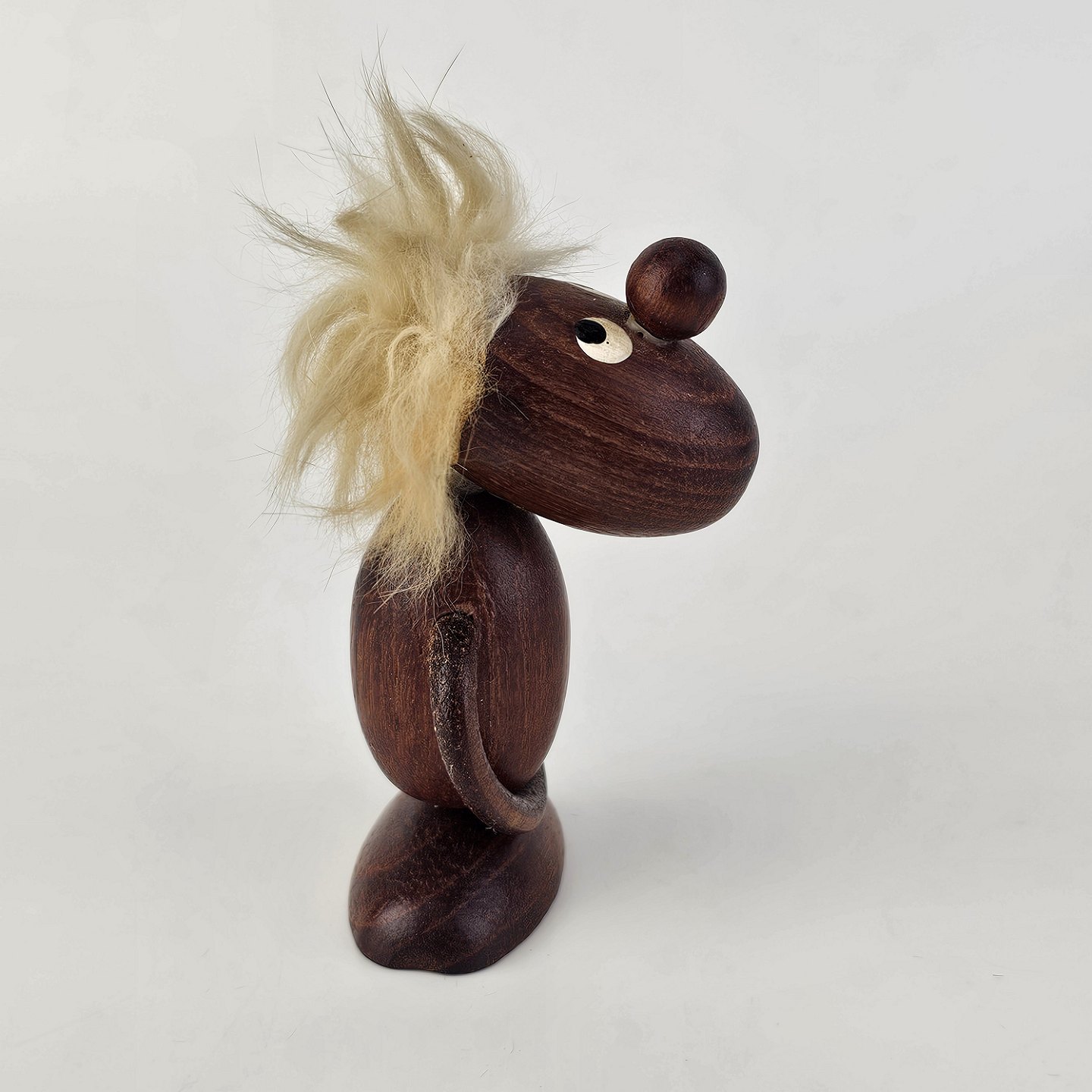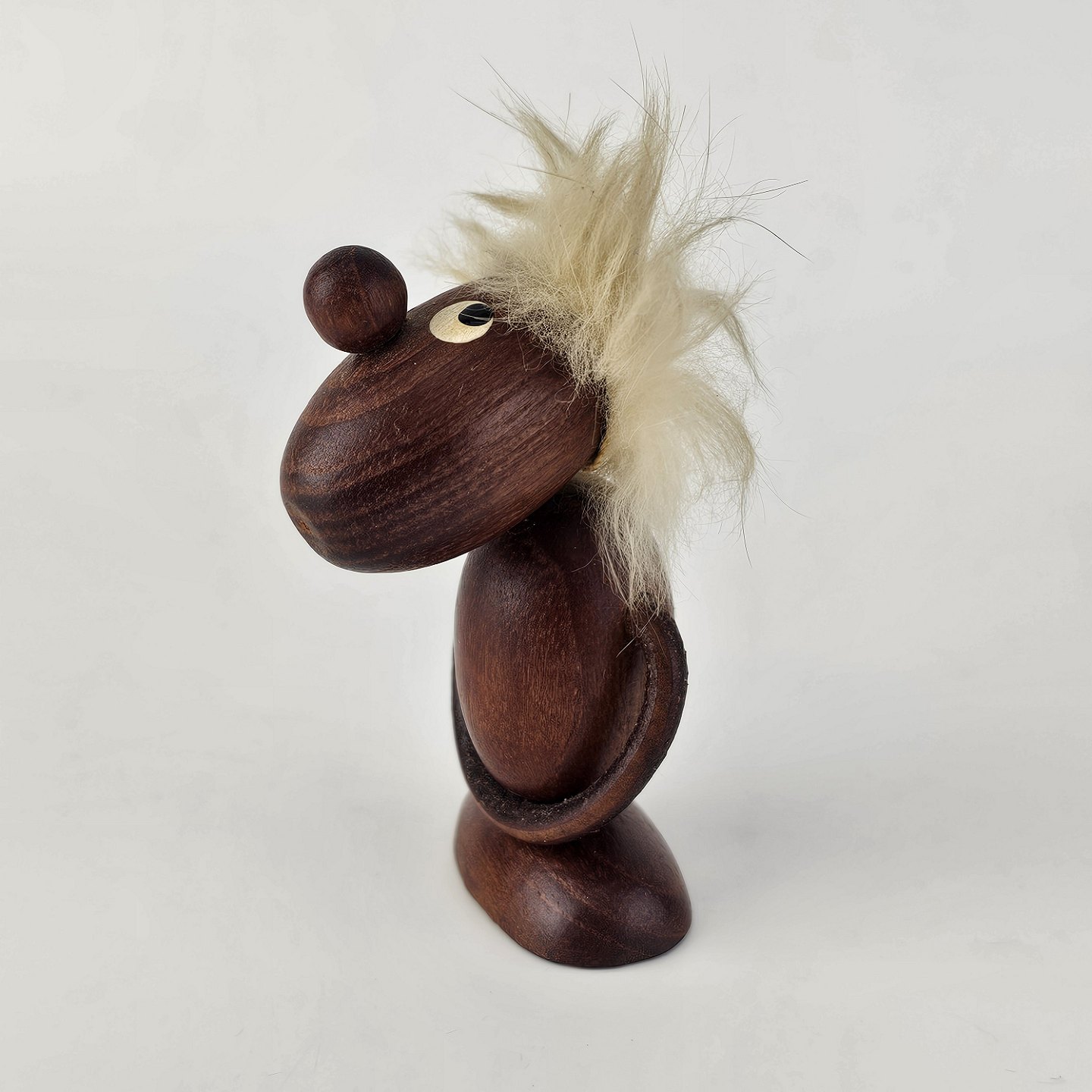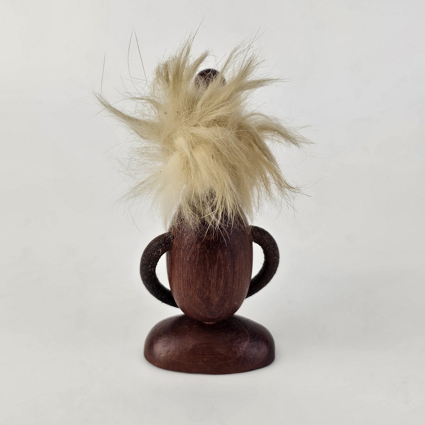 Håndskåret figur af teak med blond hår og arme af læder. Fra 1960'erneDesign Hans Bølling
