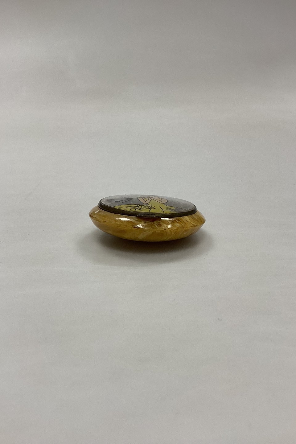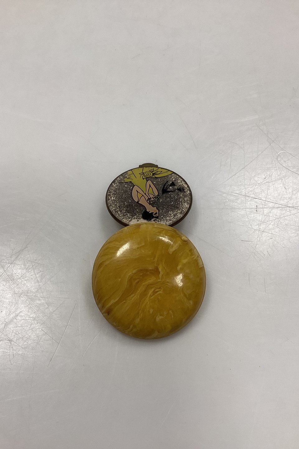 Art Deco Pilleæske med Spejl. Formentlig bakelit i gul marmorering. Motiv med kvinde i gul kjole på baggrund af sølvglitter. Måler 4,5 cm / 1,77 in.