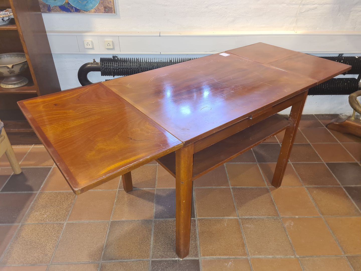 Dansk møbelsnedker sofabord m. hollandsk udtræk. Udført m. plader i fineret mahogni.Fremstår i brugt stand, overflade m. ridser og mærker.