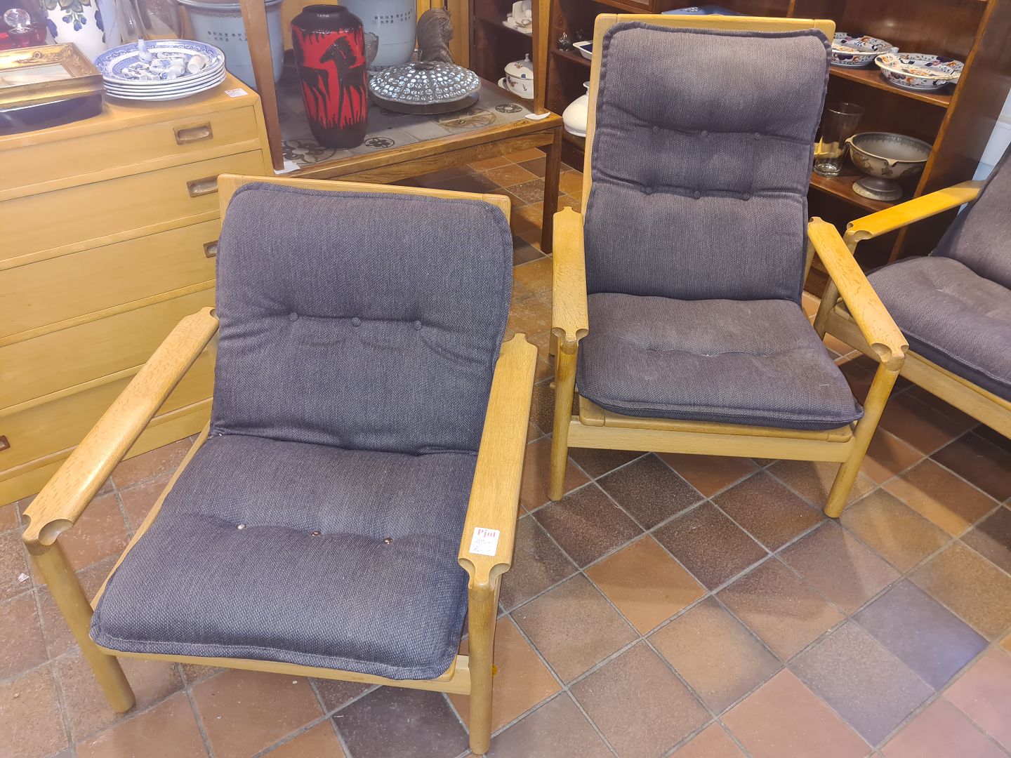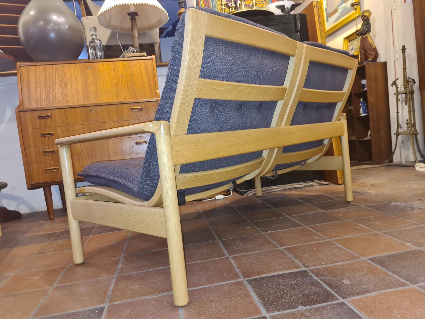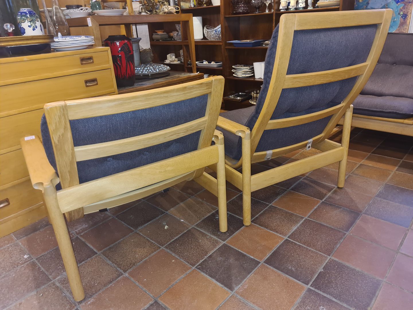 Sofagruppe udført i massiv lakeret eg m. hynder i uldstof. Produceret af Madsen & Schubell Møbelfabrik ca. 1970'erne. Fremstår i pæn brugt stand. Mål: