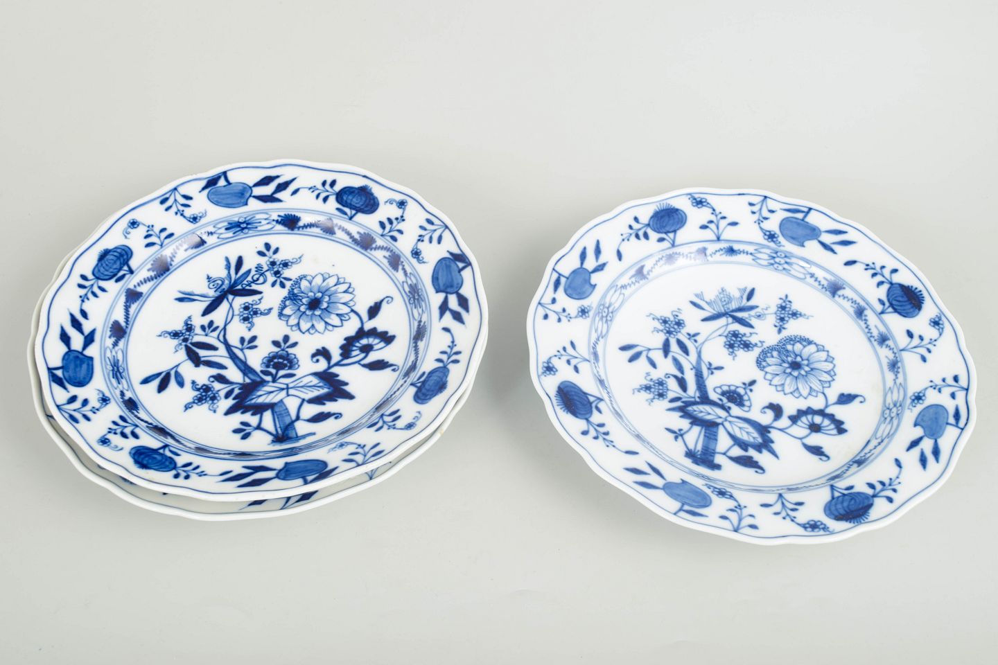 Meissen, Blue Onion dinner plates, set of 3.Dinner plates in white porcelain decorated with the underglaze blue Blue Onion pattern and a scalloped rim. Marked to the base with the Meissen crossed swords.