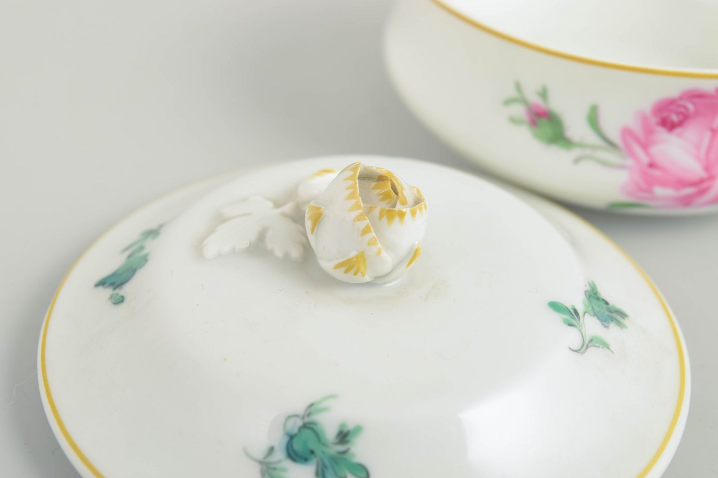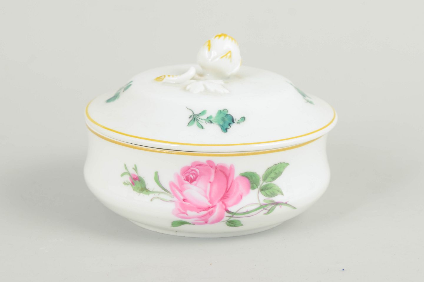 Meissen, lidded bowl.Round lidded bowl in white porcelain decorated with a hand-painted polychrome rose and small floral motifs, accented with subtle gilt detailing to the rim and foot. The finial is formed as a knop. Marked to the base with the Meissen crossed swords.