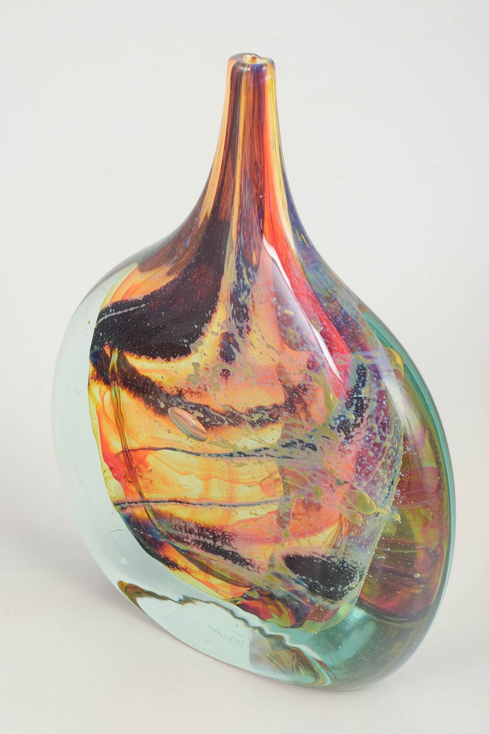 Mdina Glass, art glass vase.Organically shaped art glass vase in heavy, hand-blown glass with encapsulated swirling colours in amber, orange, and dark contrasting tones, finished with a clear outer layer. Freely formed asymmetric profile with pronounced weight in the base. Signed to the underside “Mdina glass, Malta”.
