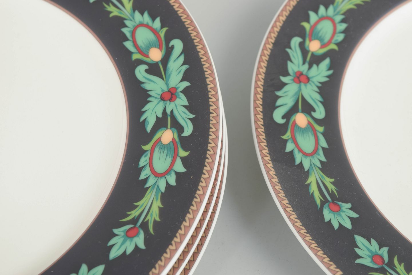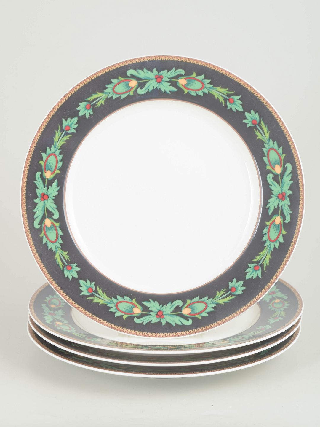 Nina Campbell for Rosenthal, set of 4 dinner plates.Set of four flat porcelain plates by Rosenthal Classic from the Mayfair series, decorated with a dark border, stylised green foliate motifs and gilt detailing, produced in the 1980s.