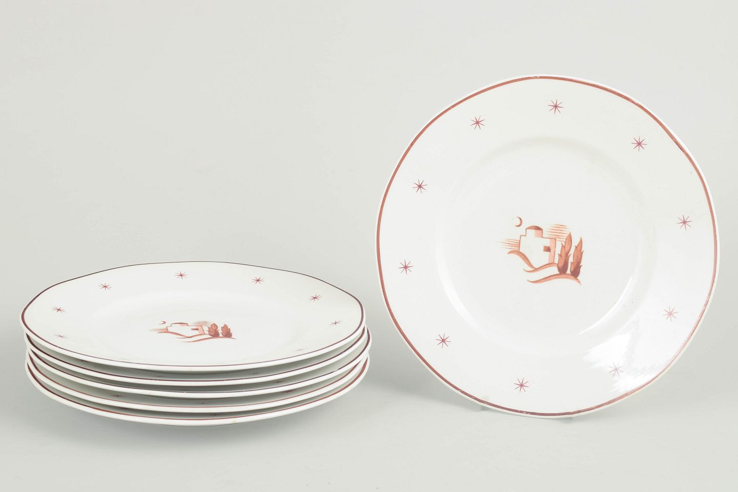 Arabia, Orient, set of 6 small lunch plates.Small plates in glazed earthenware with a scalloped rim, brown border line and star motifs, featuring a central oriental landscape motif. Orient model.
