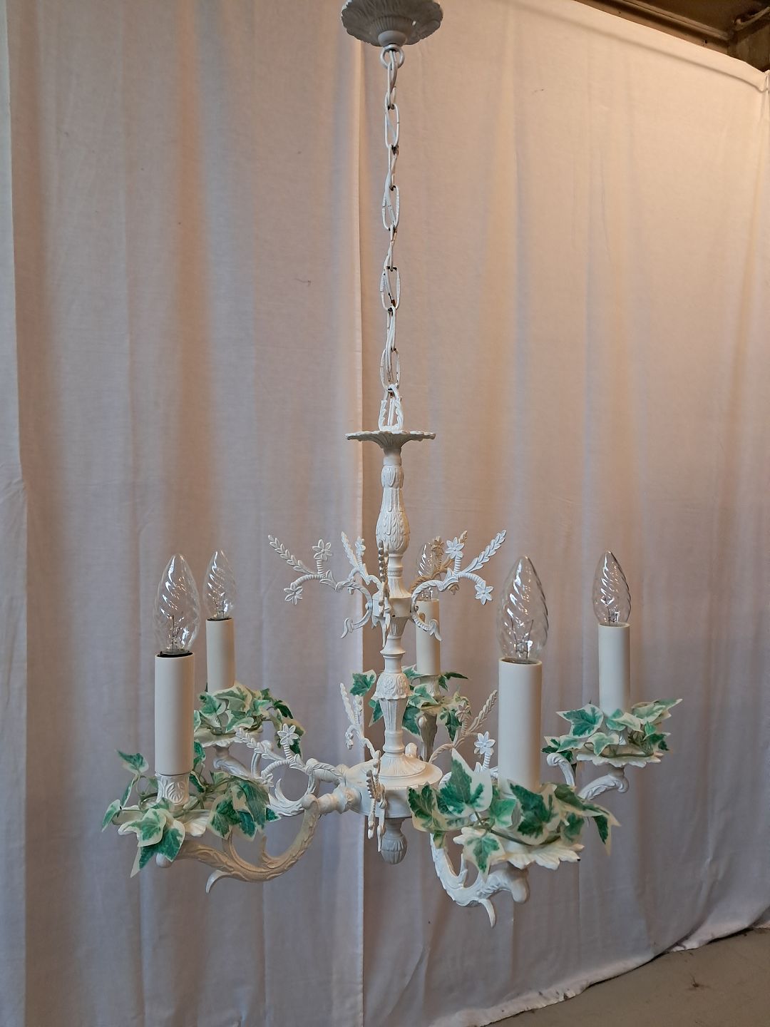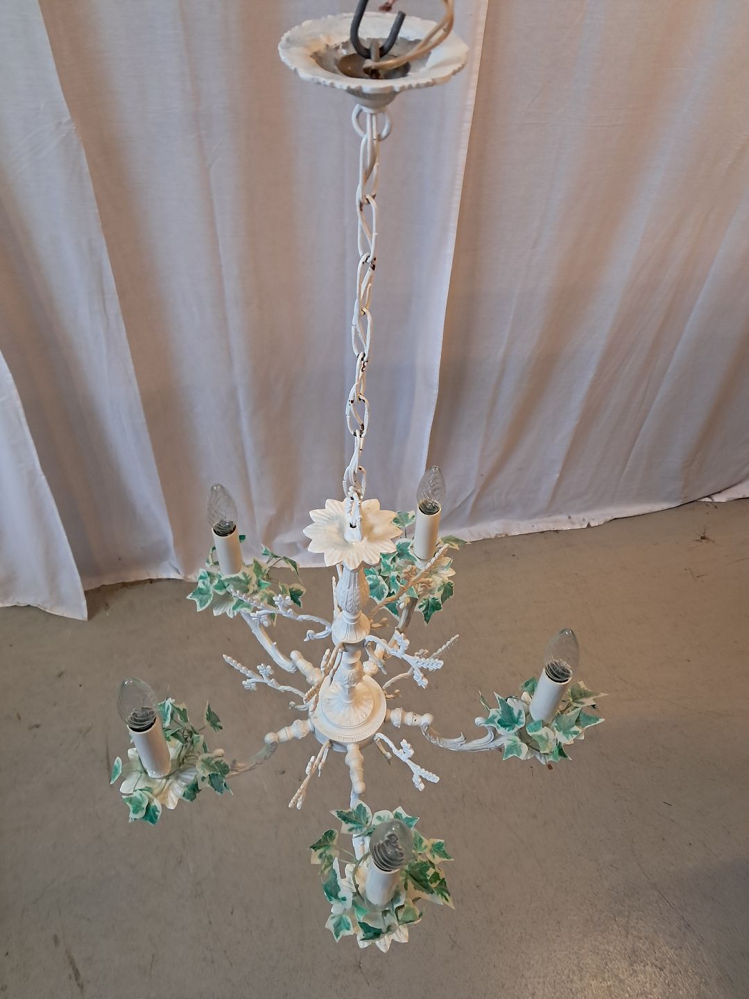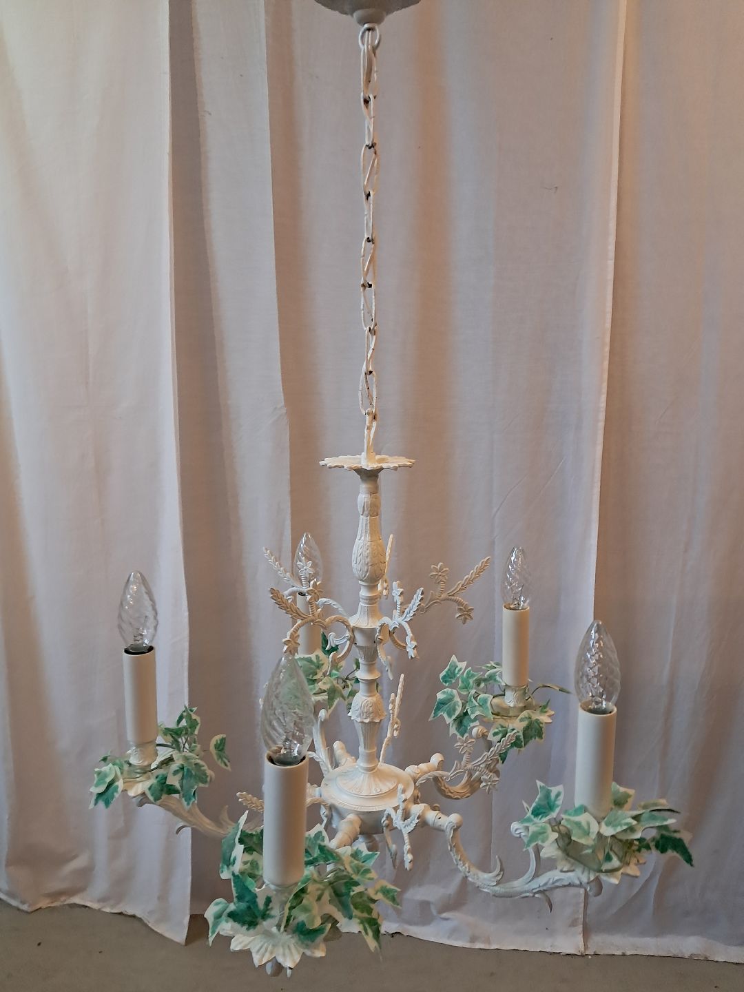Lysekrone i malet metal, fra 1980erne.Den har brugsspor.