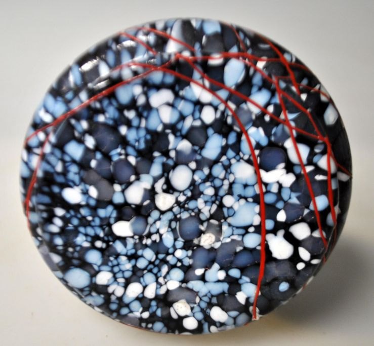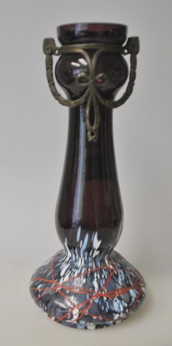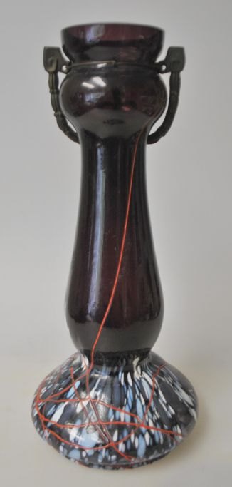 Jugend vase, approx. 1900, Germany. Violet glass with base of white, blue and gray glass. Above red glass line. Mounted with bronze decoration. H.: 25.2 cm.Exciting piece!