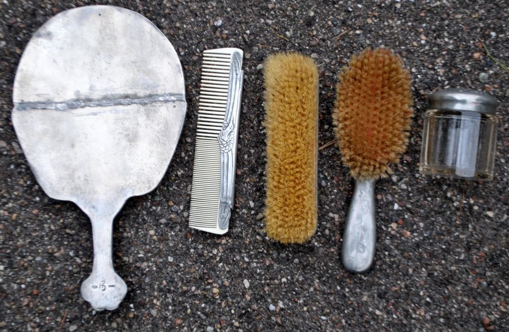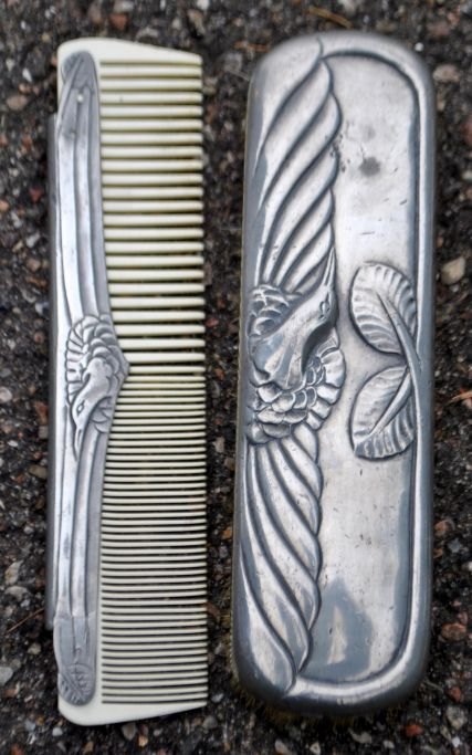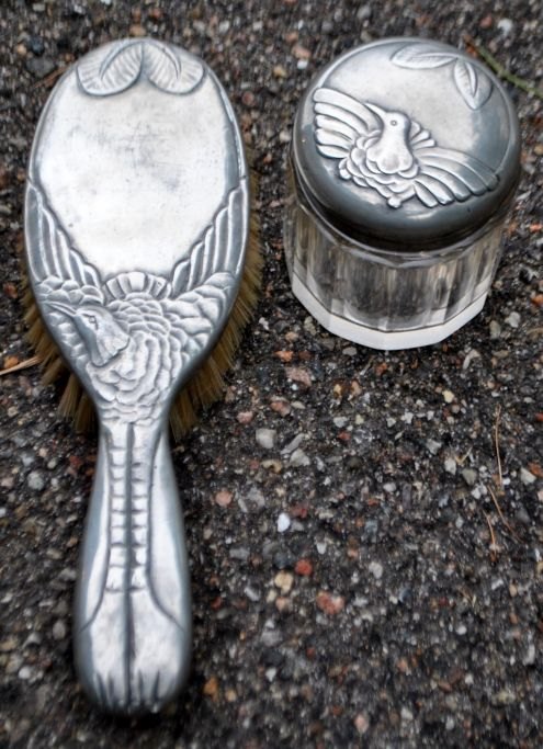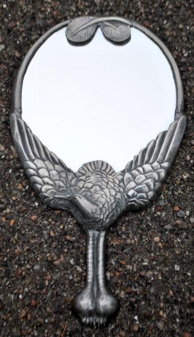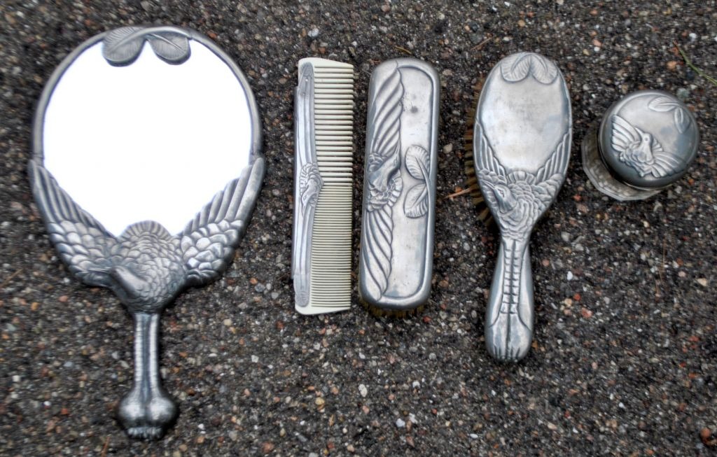 Hertz/Mogens Ballin toilet set in pewter, art deco, design 1719. approx. 1920. Copenhagen, Denmark. Consisting of mirror, comb, 2 brushes and lidded jar. Decoration with crane and foliage. Mirror length: 33 cm. Stamped.The set is only sold as a whole! Made around 1915.