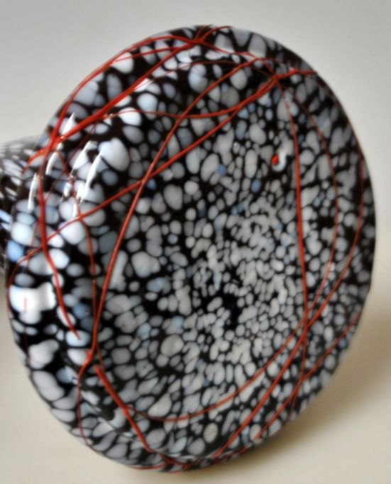 Jugend vase, ca. 1900, Germany. Violet glass with a base of white, blue and grey glass. Red glass line above. H.: 29.5 cm.Exciting piece!