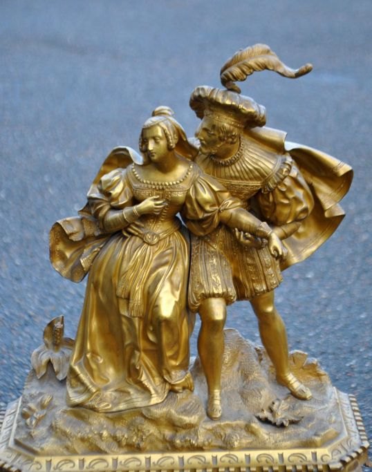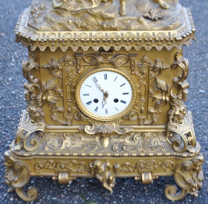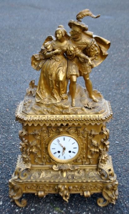 French mantel clock in gilt bronze, 1810 - 1820. Charles X. The clock is decorated with figures depicting a cavalier and a woman. Detailed case. With white enamel dial. H.: 70 cm. W.: 39 cm. D.: 14 cm.Item number: 28759