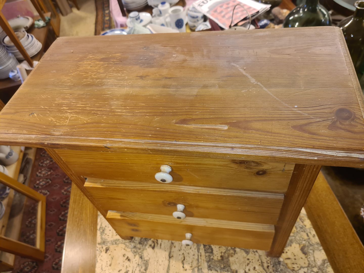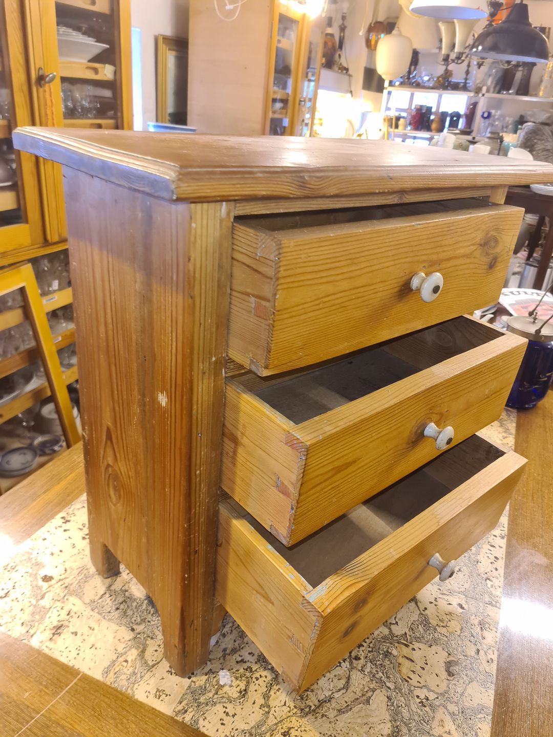 Lille kommode i massiv fyrretræ. Fremstår med brugsspor, produceret ca. 1930'erne.