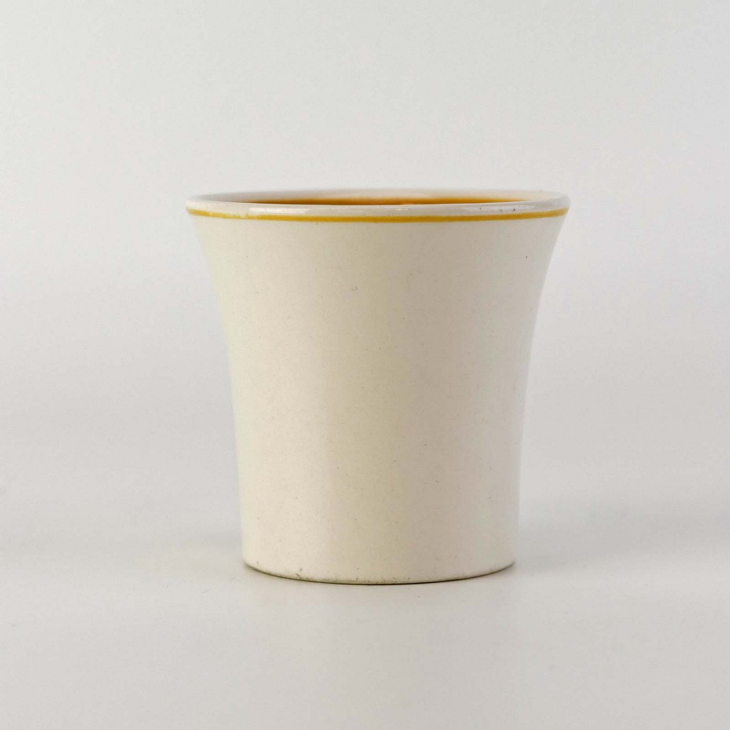 Glat fajancestel med dekoration i brune og gule farver på lys bagggrund med mørkebrun streg.