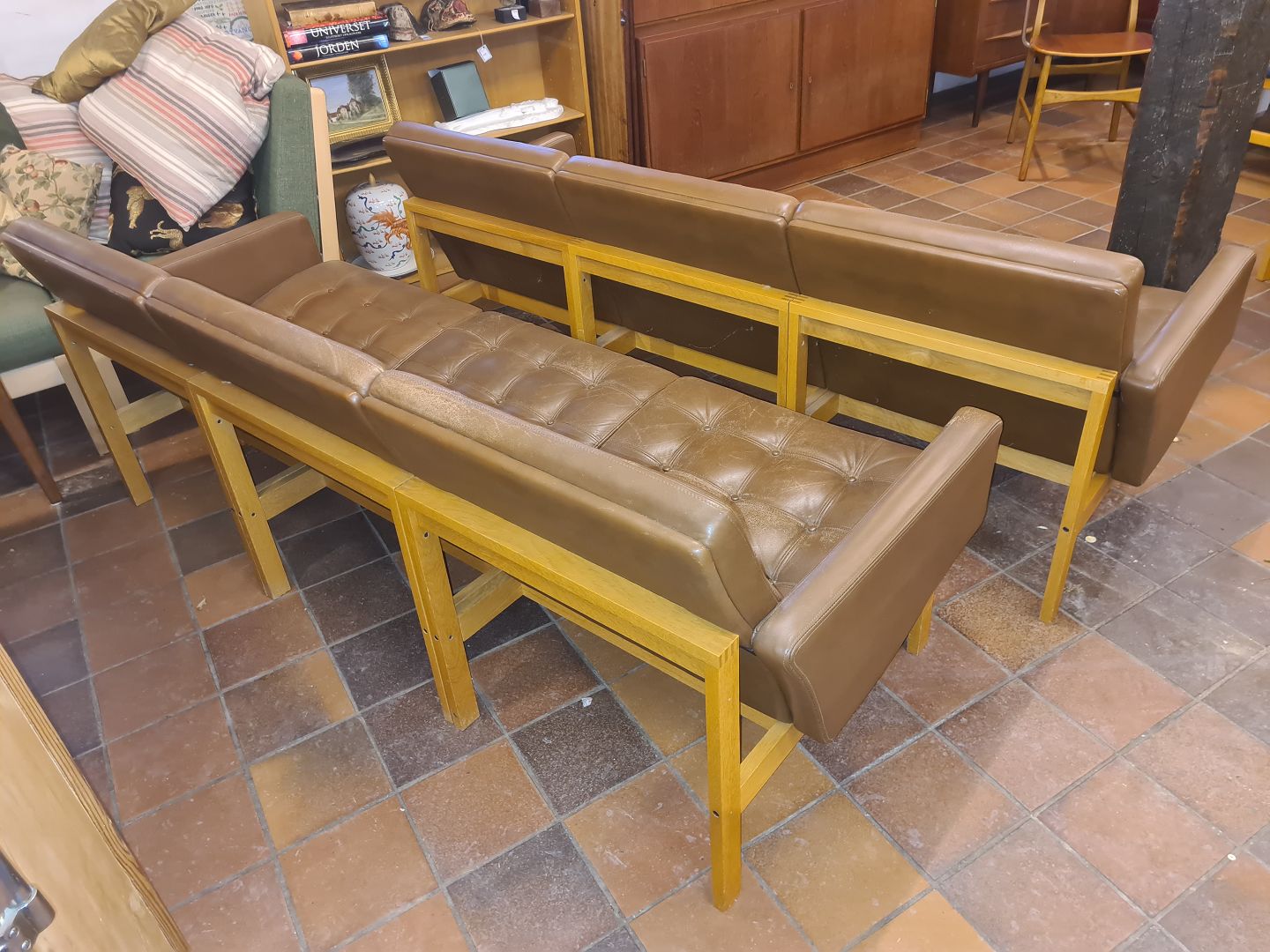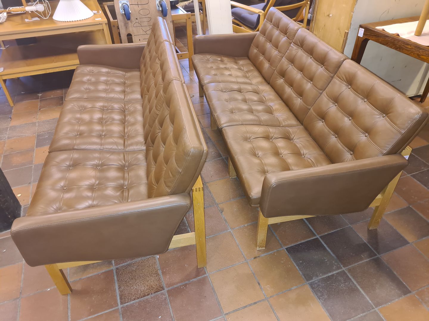 Par 3 personers sofaer i eg og læder designet af Ole Gjerlev Knudsen Moduline model. Fremstillet i 1970'erne. Fremstår står pæne og ok velholdte dog med lidt overfladiske brugsspor på den ene og mindre hul i sæde på den anden. (Billeder)Højde 73 cm. Bredde 187 cm. Dybde 74 cm.