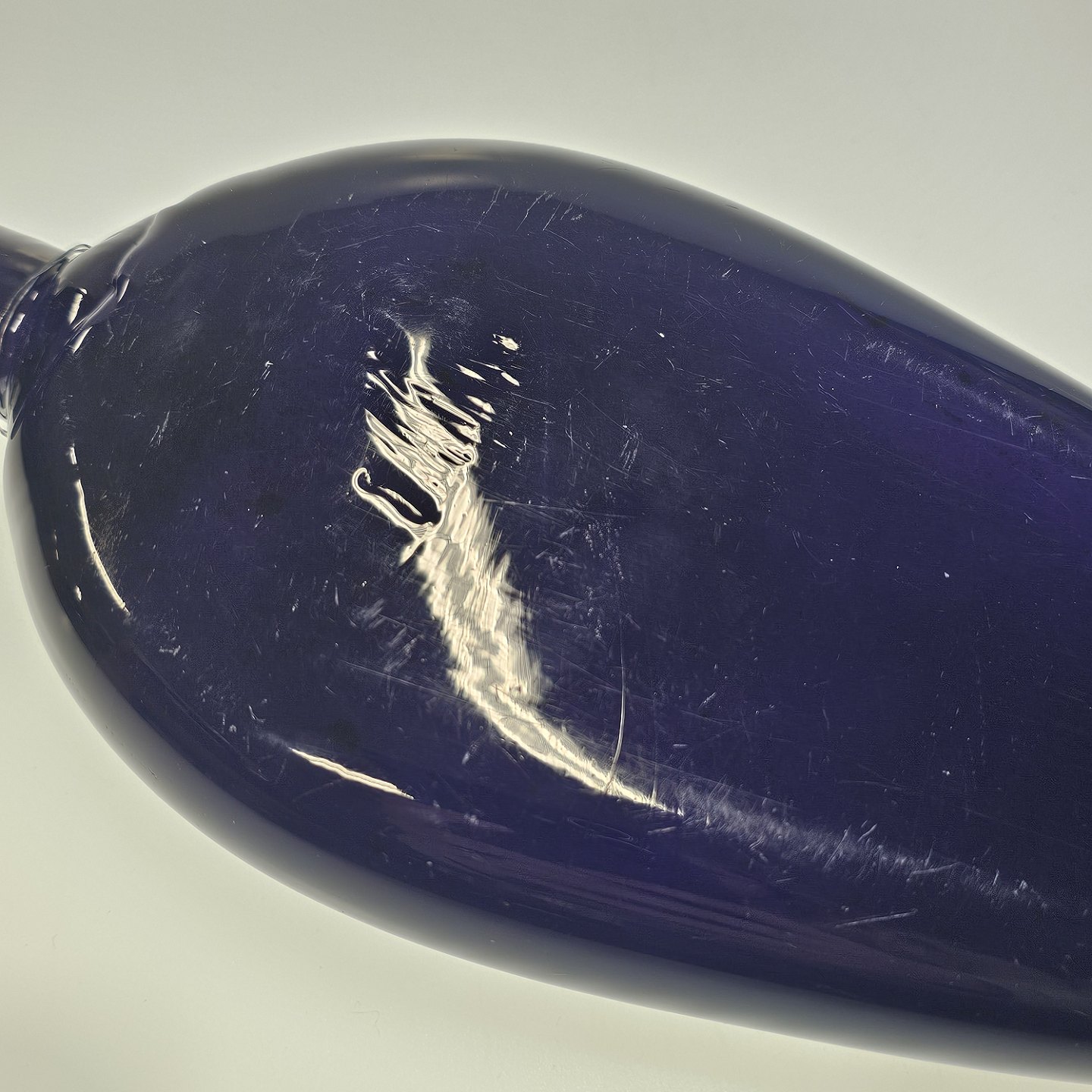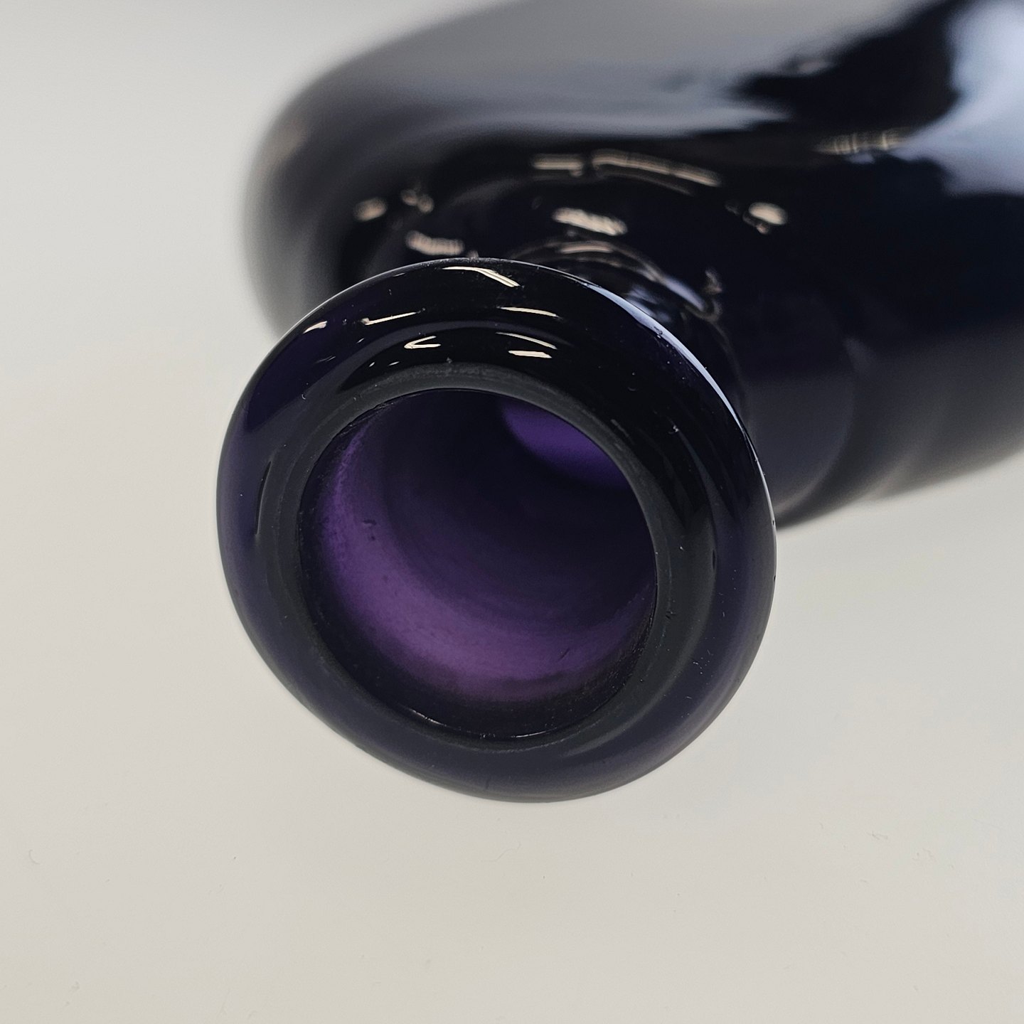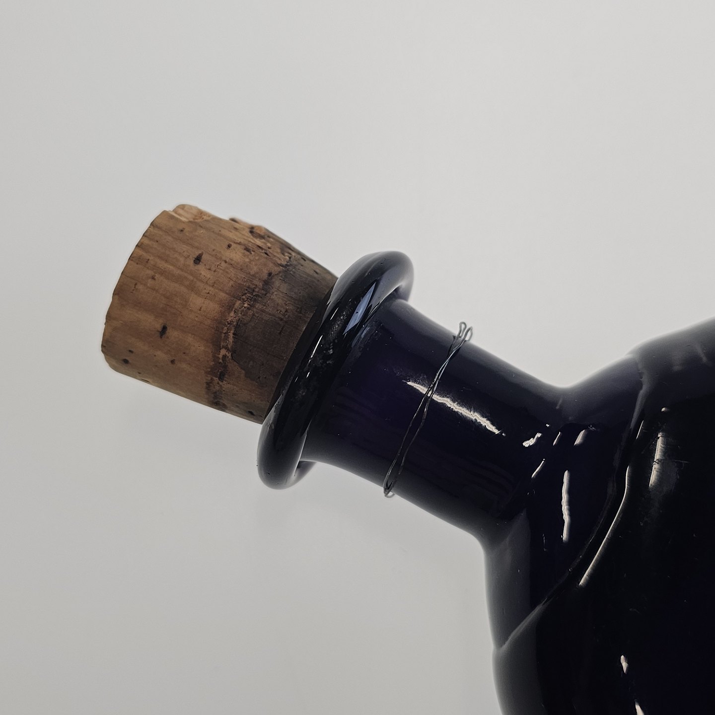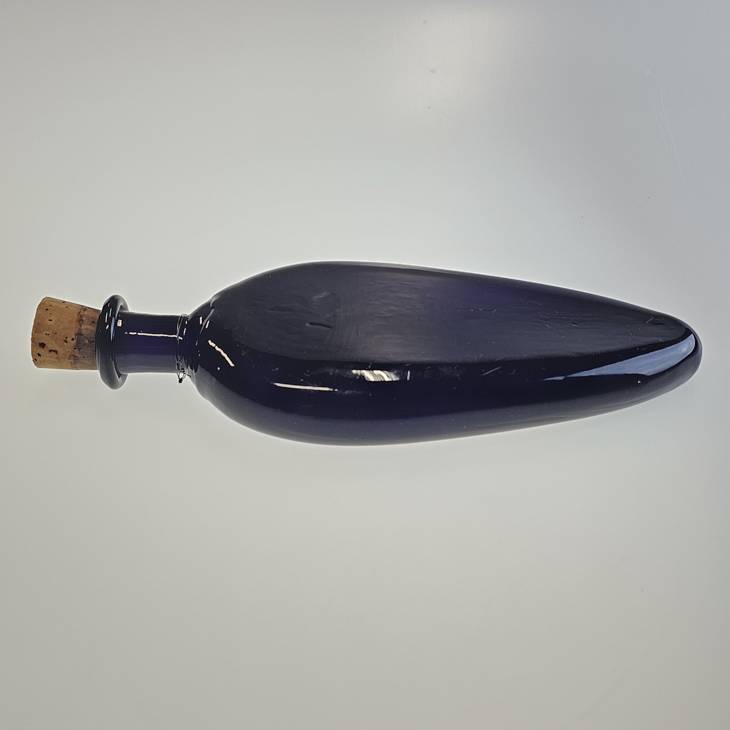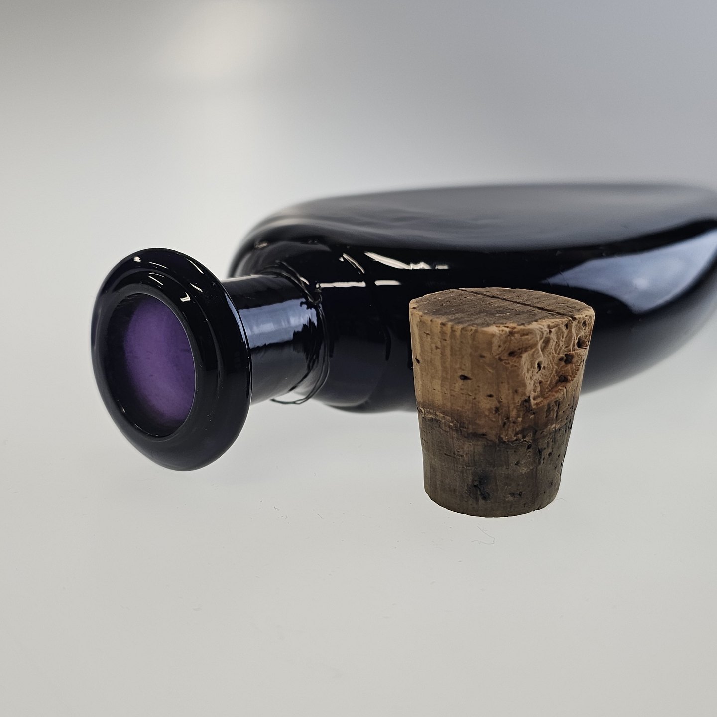 Håndblæst dråbeformet flaske i lilla glas med korkpropProducent ukendt