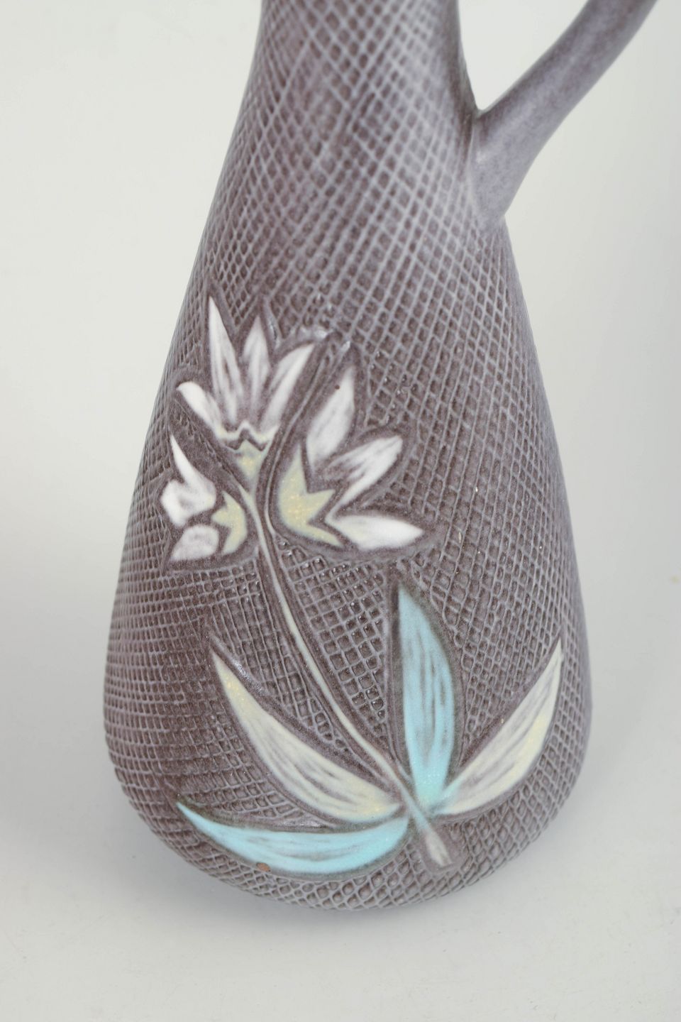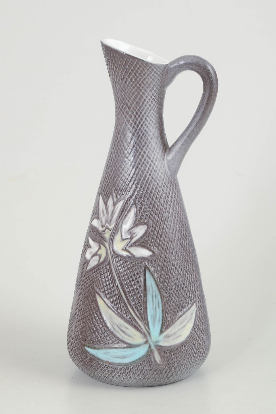 Elegant stoneware pitcher with a grey-violet finely textured surface and relief decoration featuring stylised leaves in light turquoise and white tones. Slender organic form with an integrated handle. The base is stamped and marked with model number 4499.