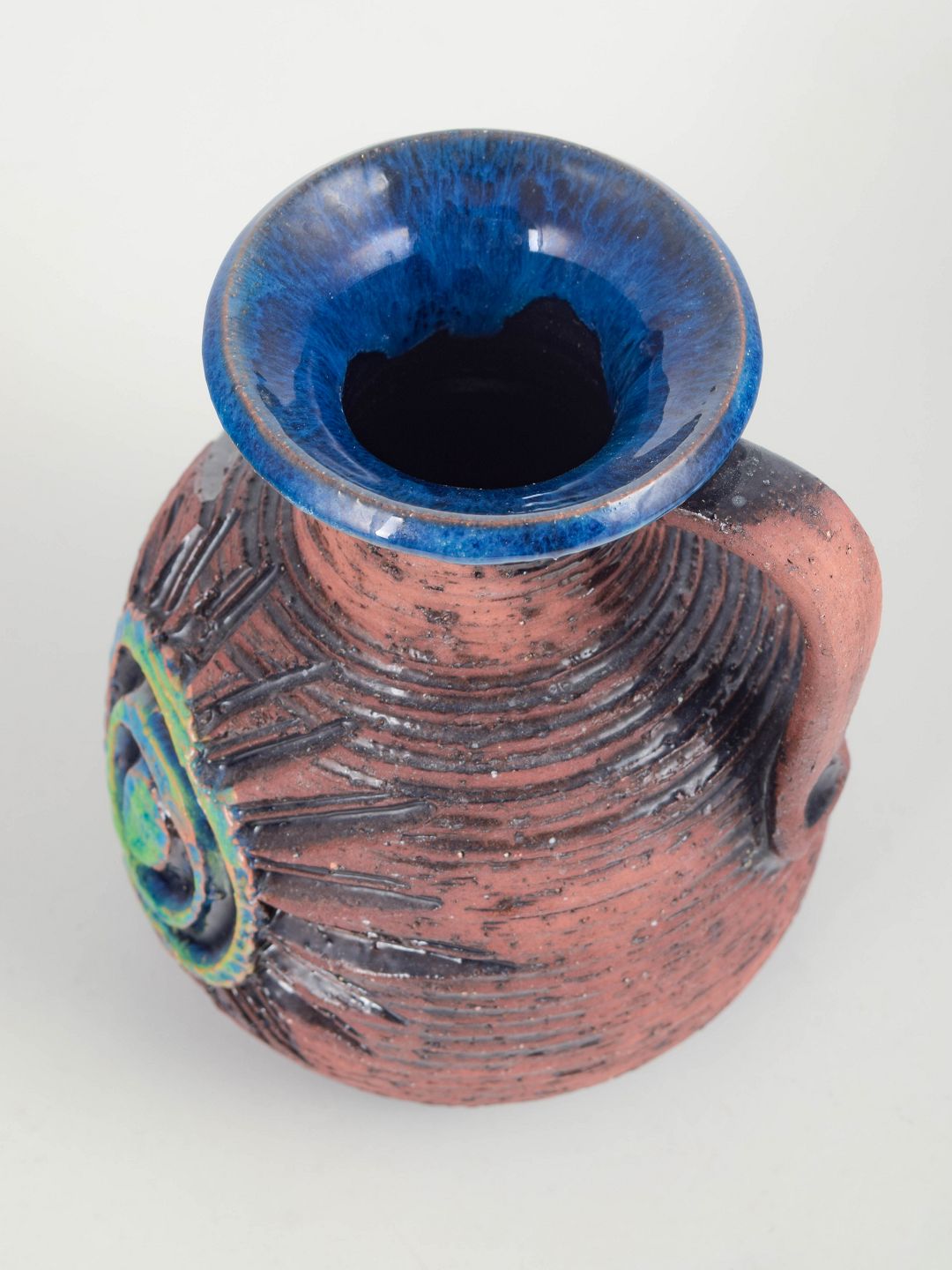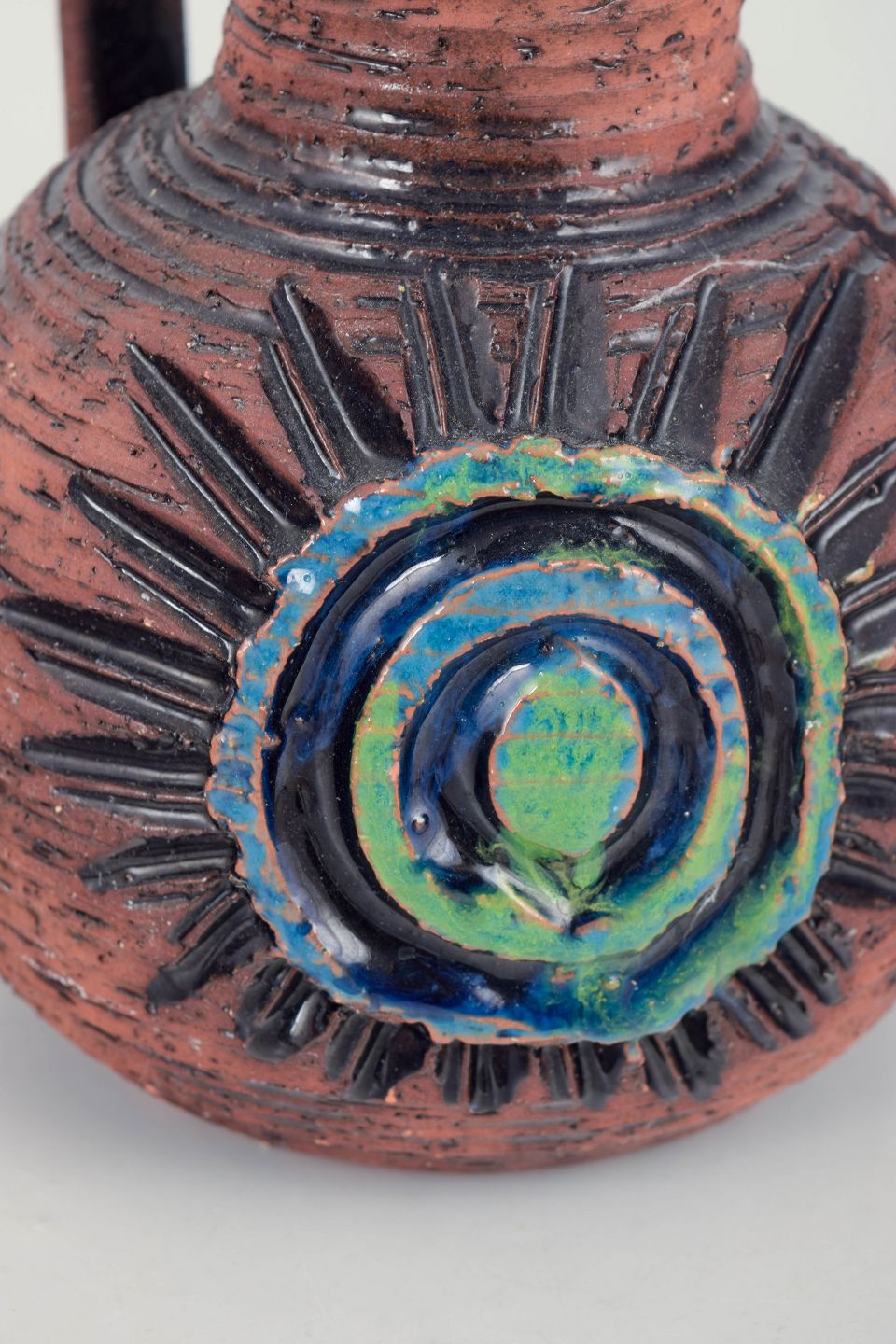 Ninnie Forsgren for Bromma Keramik, pitcher.Organically shaped pitcher in thrown stoneware with a coarse, rustic surface in reddish-brown tones and a decorative relief with a circular motif in blue and green glazes. Model 193.