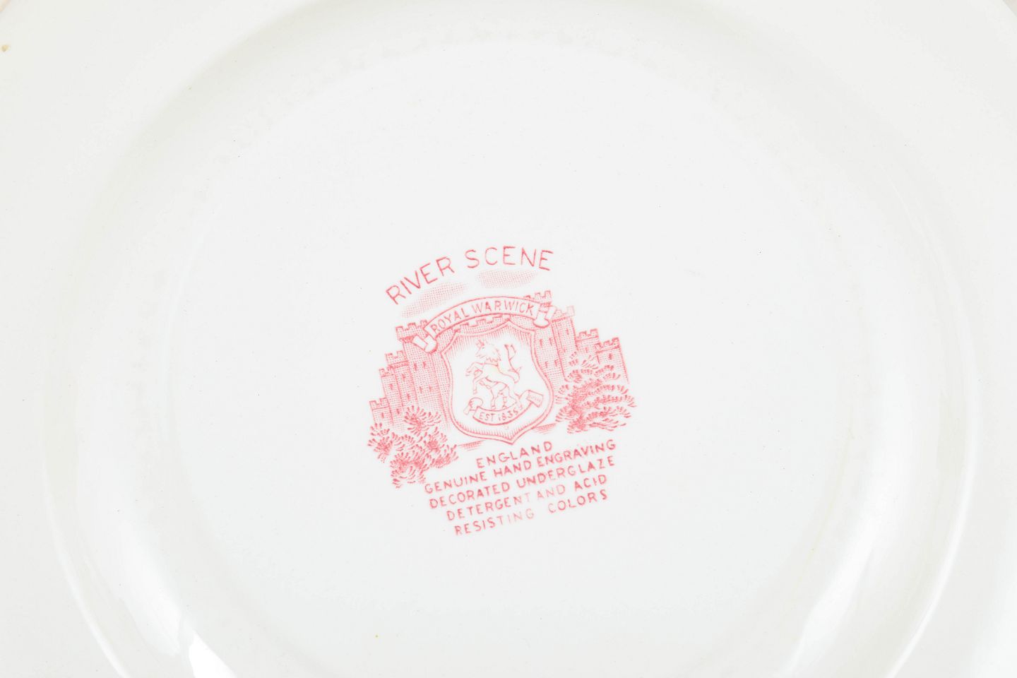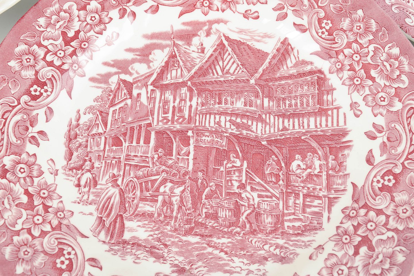 Faience dinner plates by English makers, decorated in red transferware with landscape and ornamental motifs.