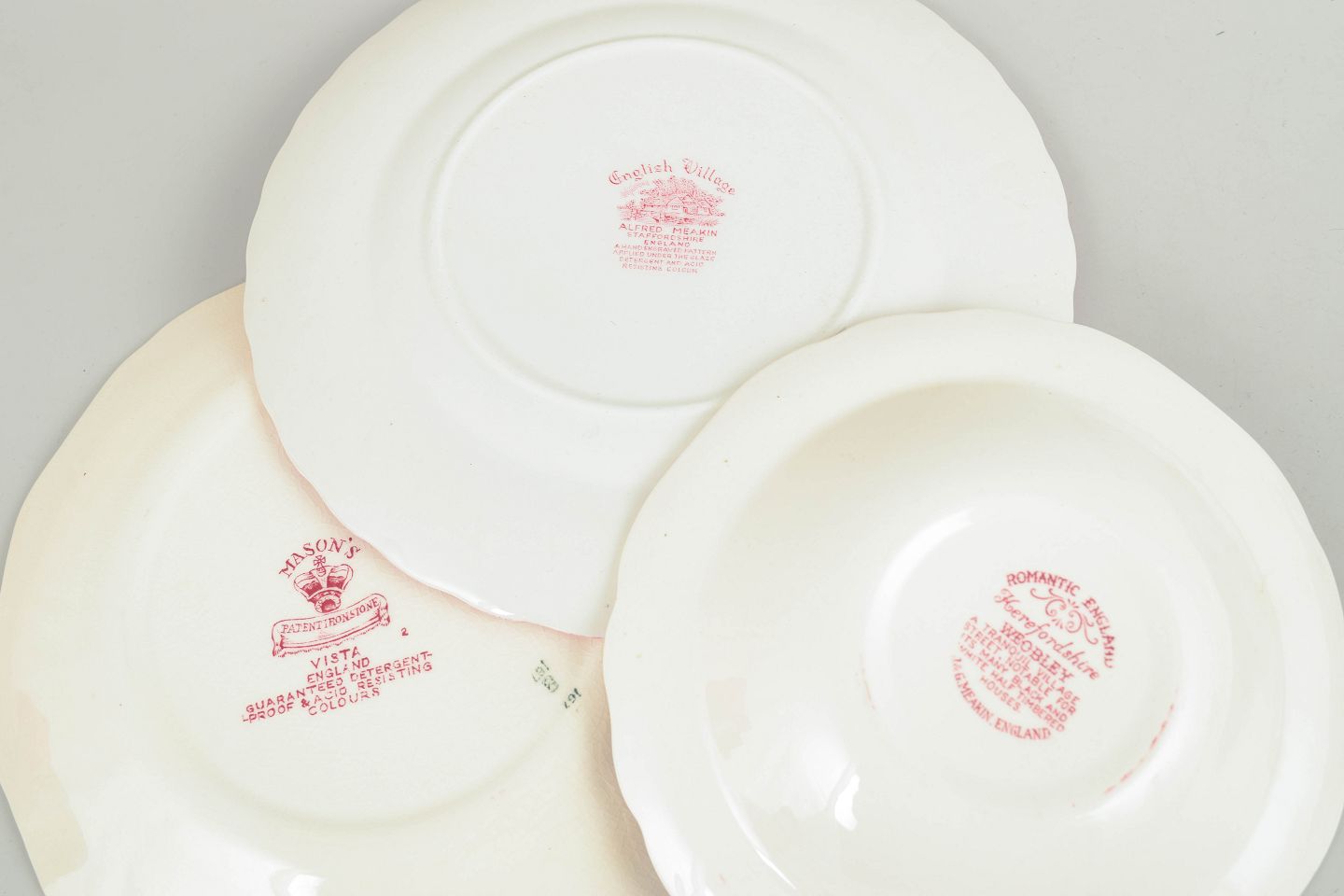 Set of plates and bowl, Mason’s and other English makers.Faience set comprising salad plates and a bowl, decorated in red transferware with landscape and ornamental motifs by various English manufacturers, including Mason’s.