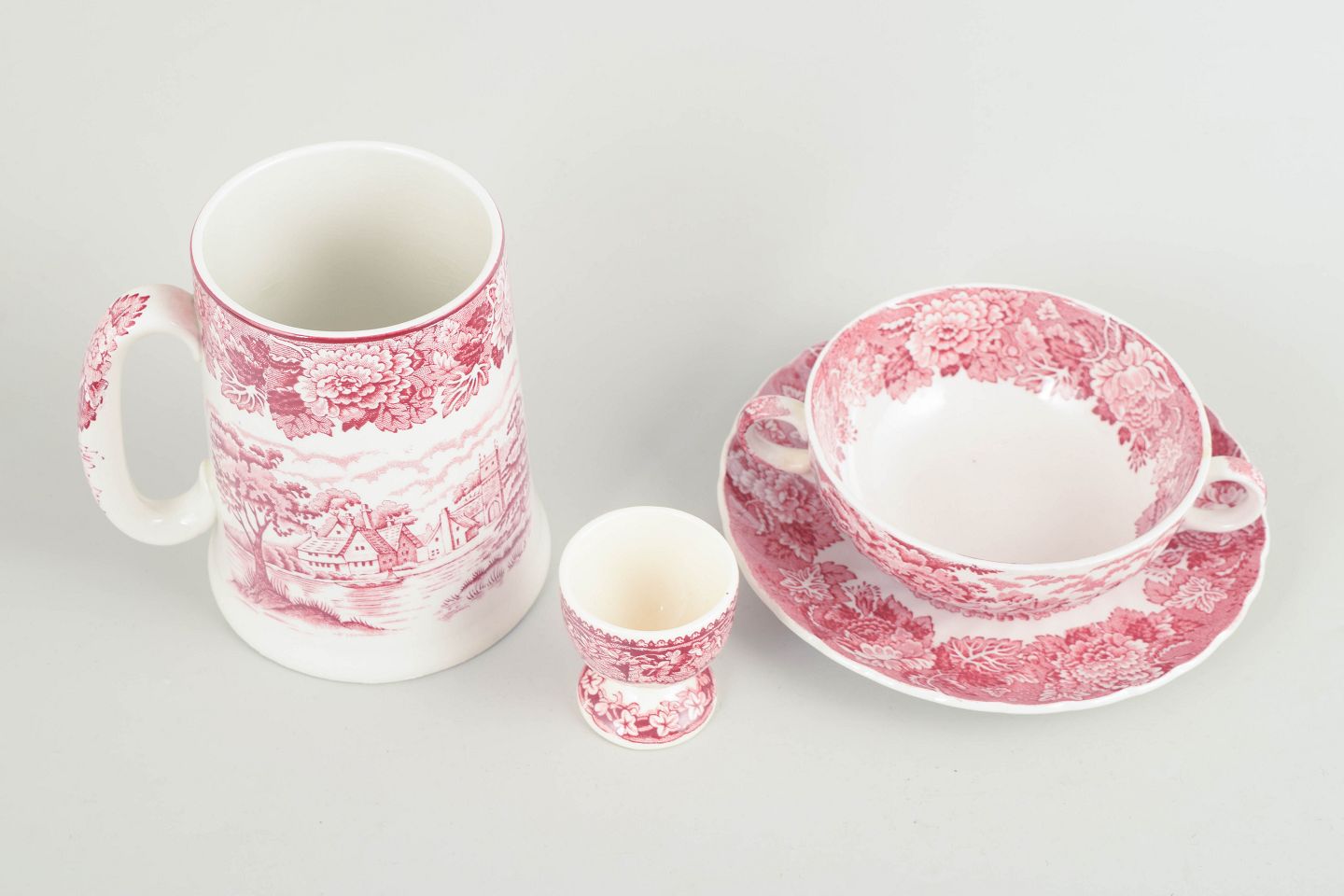 Mason’s, Wood & Sons, set of beer jug, bouillon cup with saucer and egg cup.Faience set by Mason’s / Wood & Sons, decorated in red transferware with landscape and ornamental motifs.