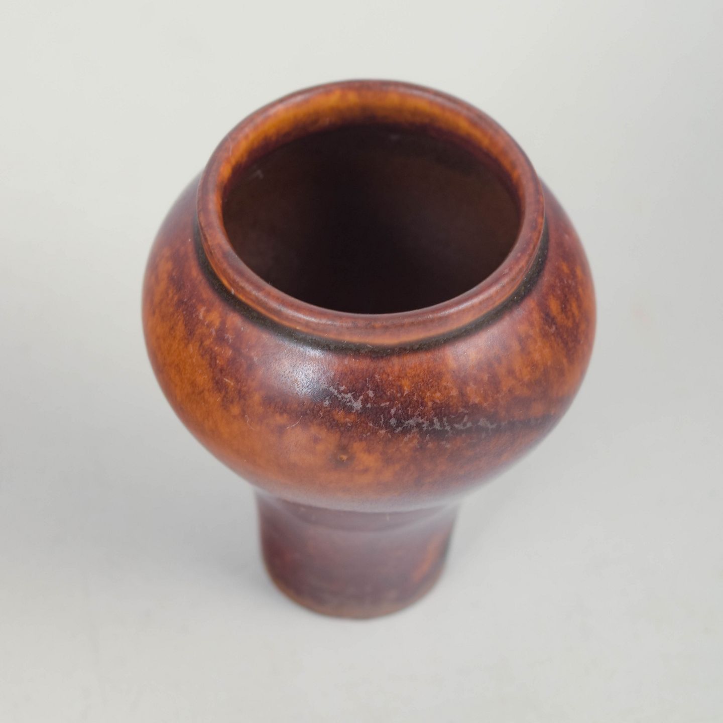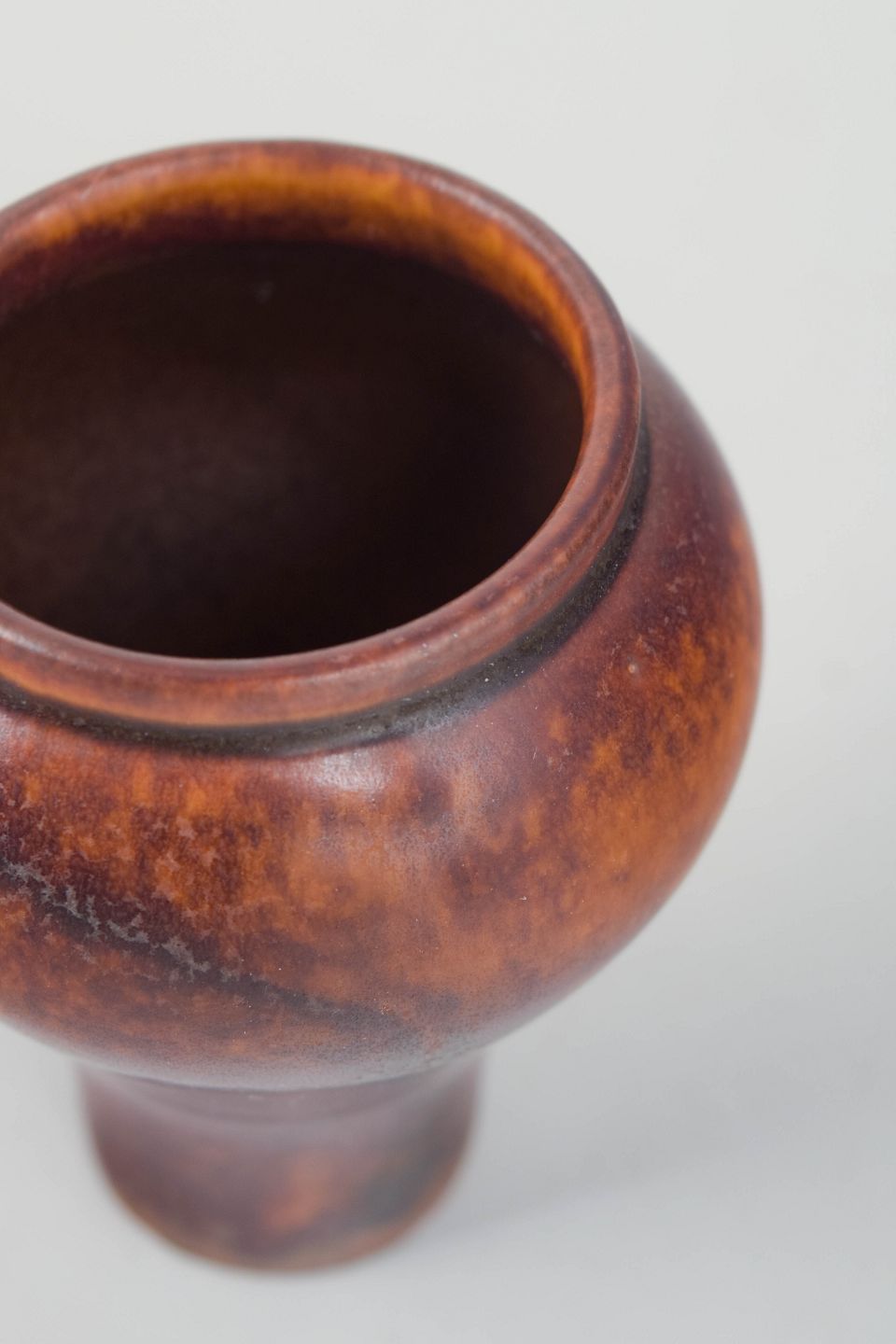 Miniature vase, Arabia, Finland.Small hand-thrown miniature stoneware vase with a warm brown glaze showing subtle surface variation. Signed to the base.