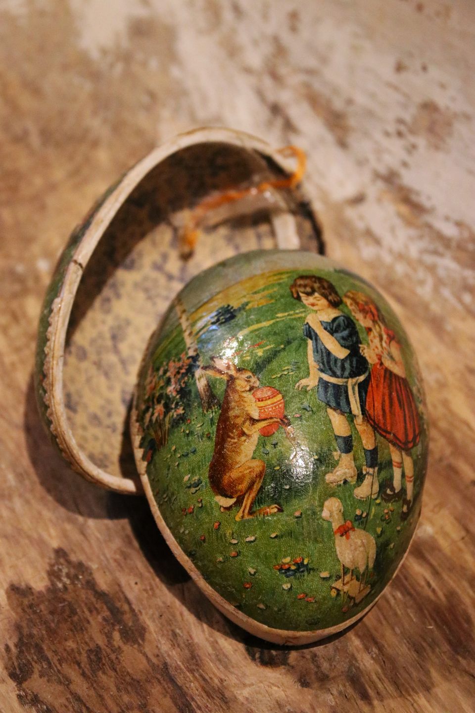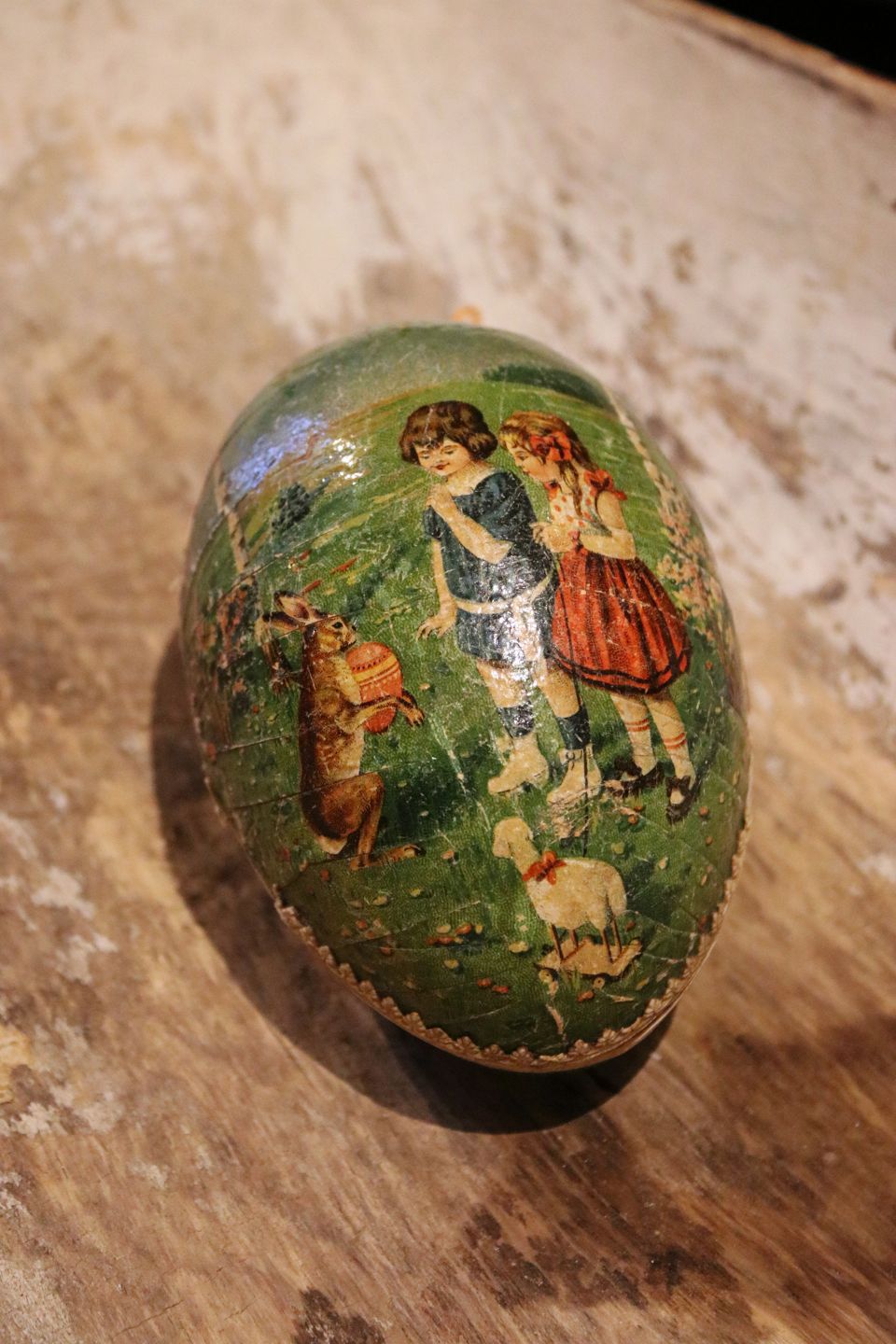 Old Easter egg in papier-mâché from the early 1900s with a motif of a little boy and girl with the Easter bunny. Height: 11.5cm.Item number: Påskeæg nr.1