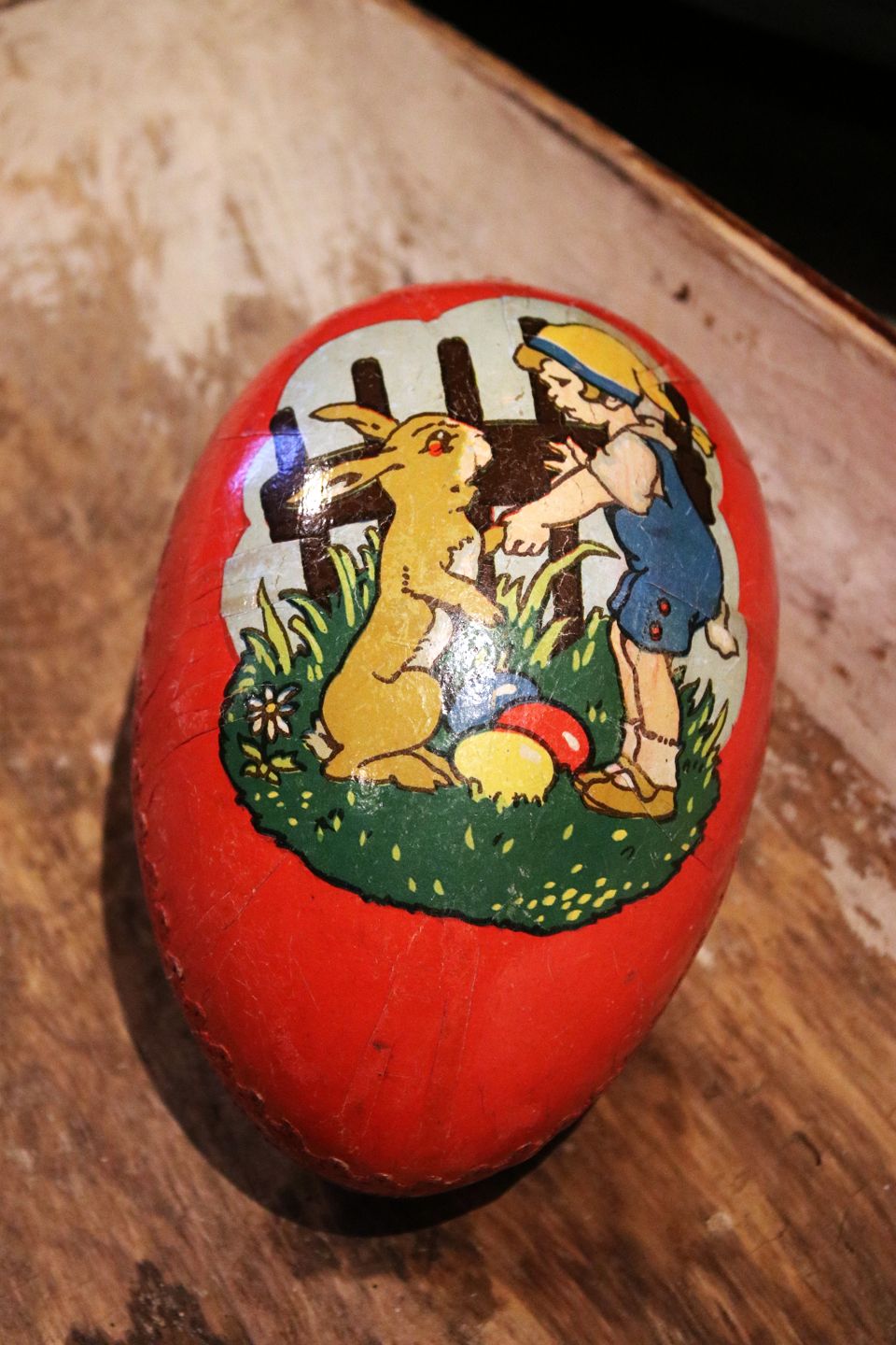 Old Easter egg in painted cardboard from the early 1900s with a motif of a little boy and girl with the Easter bunny. Height: 16cm.Item number: Påskeæg nr.5