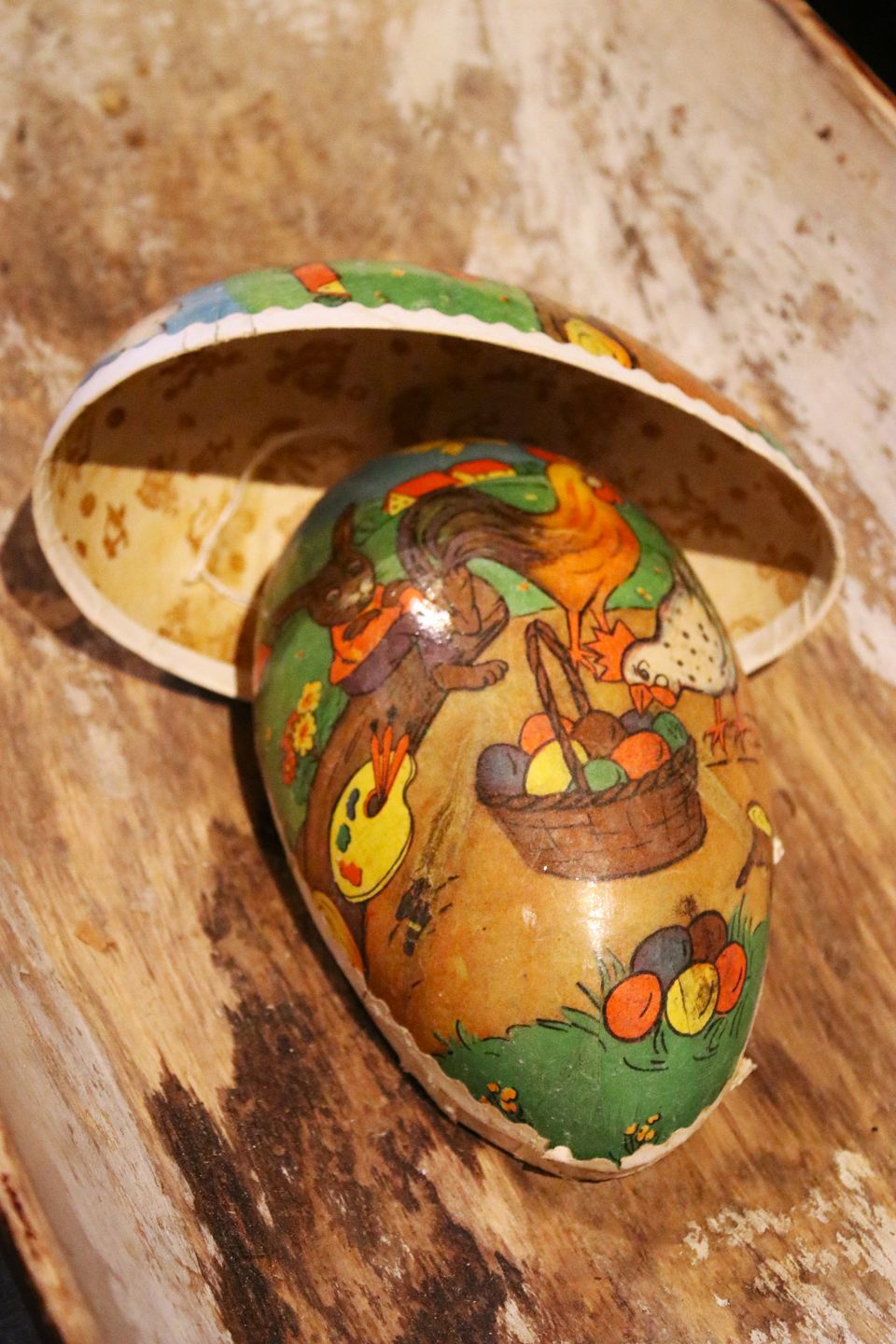 Old vintage Easter egg in papier-mâché with a motif of an Easter bunny and chickens collecting Easter eggs. Height: 17cm.Item number: Påskeæg nr.6