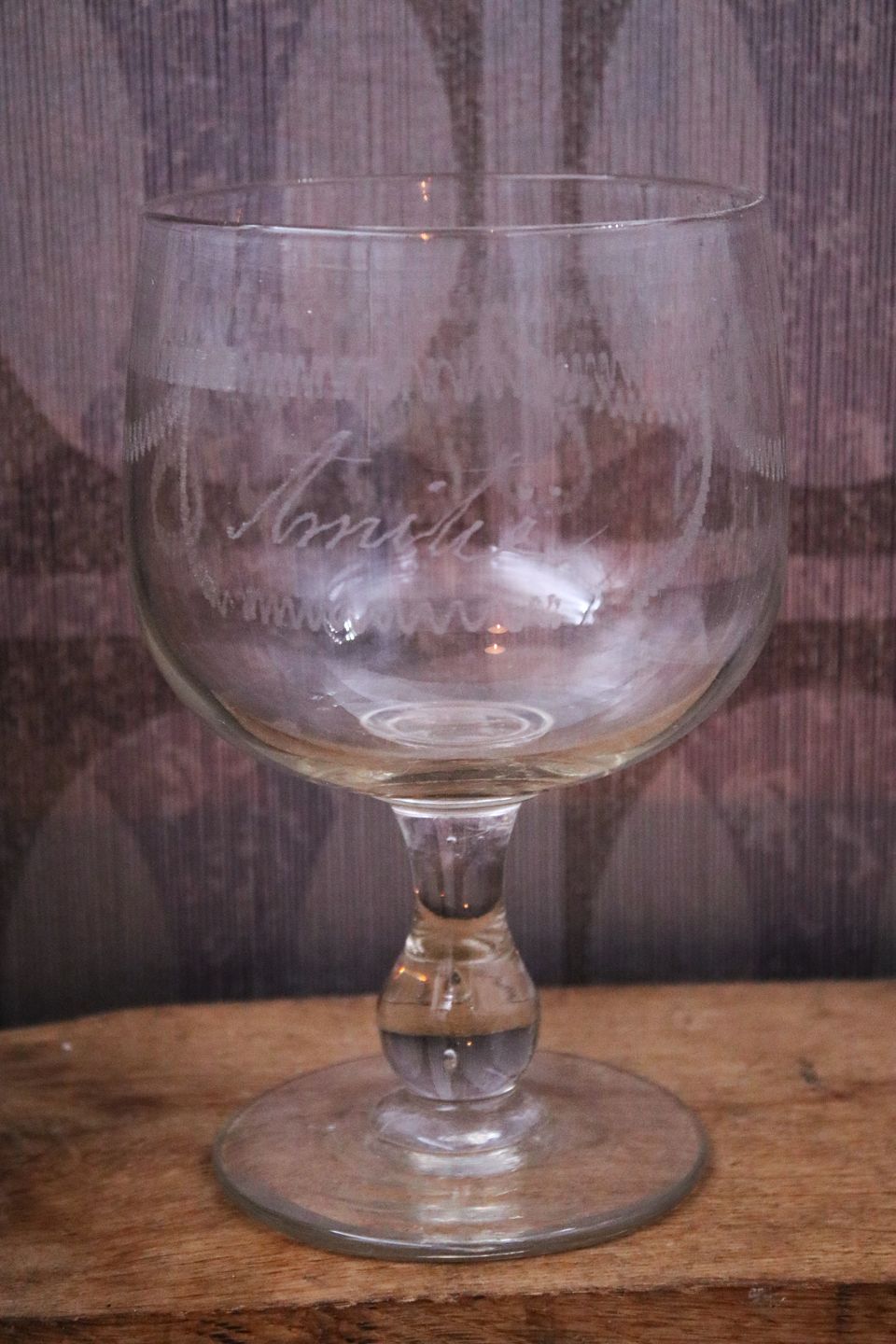 LARGE antique French mouth-blown souvenir glass with the inscription "Amitie" which means Friendship. H: 18.5cm. Dia.: 12cm.Decorative as a candle glass or simply to drink a good glass of red wine from.