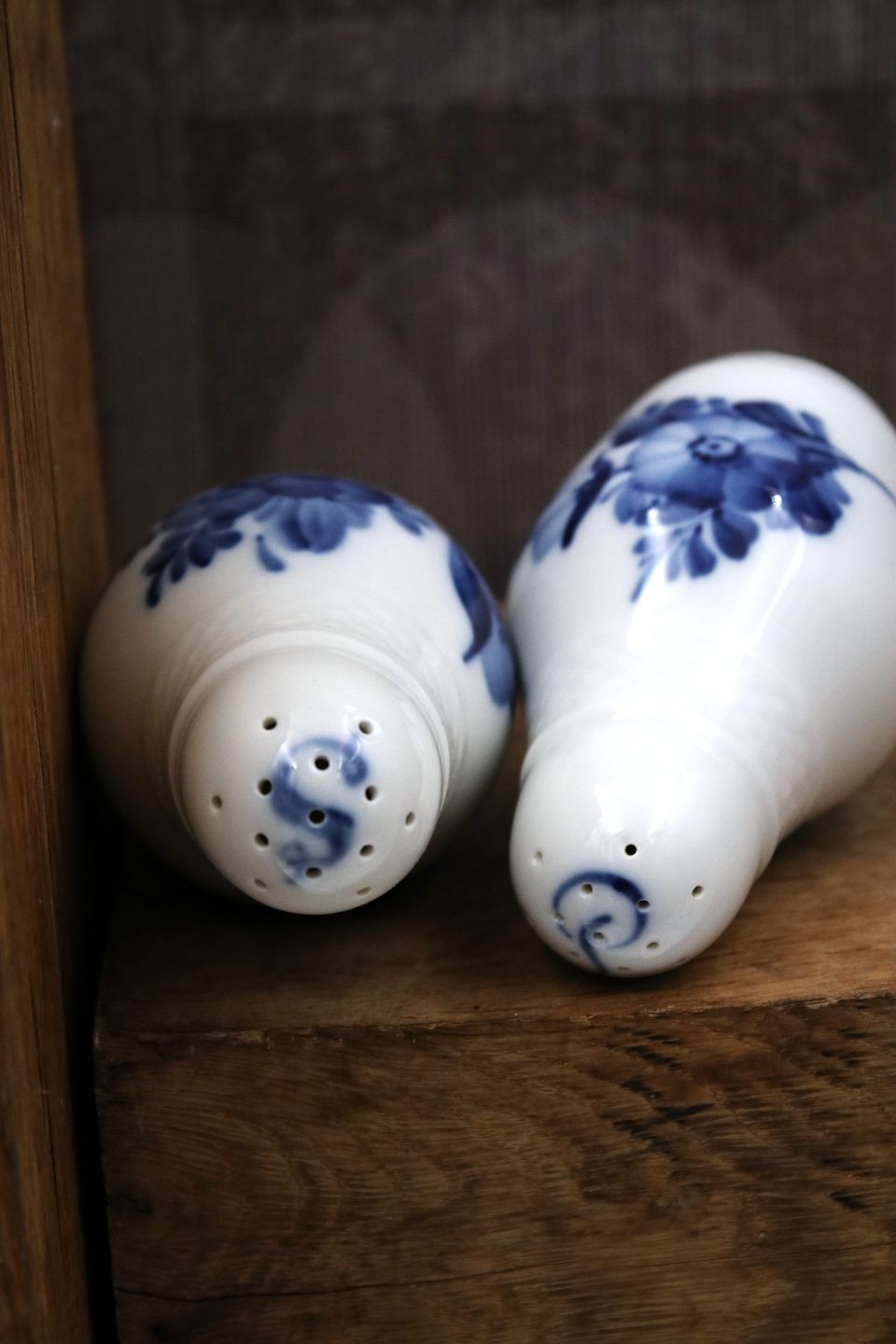 Royal Copenhagen, Blue Flower Braided salt & pepper set.H: 10cm. Decoration number: 10/8221 and 10/8225.