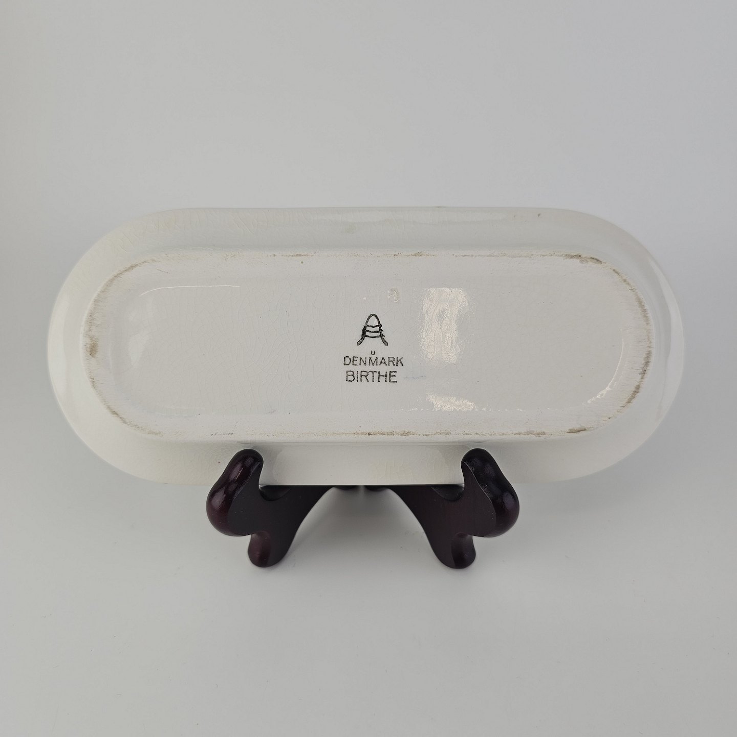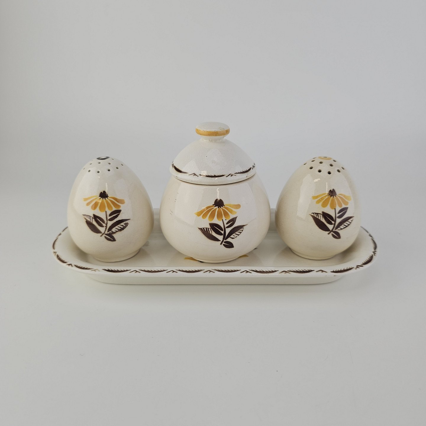 Trekantet fad med sennepskrukke, saltbøsse og peberbøsse i fajance fra stellet BirtheFormgiver Nils Thorsson