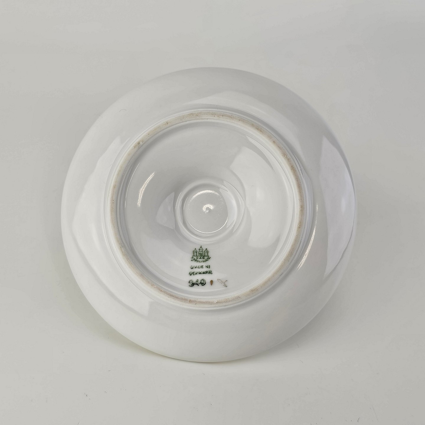 Krysantemum er hvidt porcelæn dekoreret med lys lilla blomst, grønne blade og guldkant.
