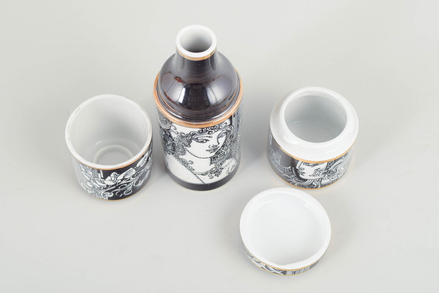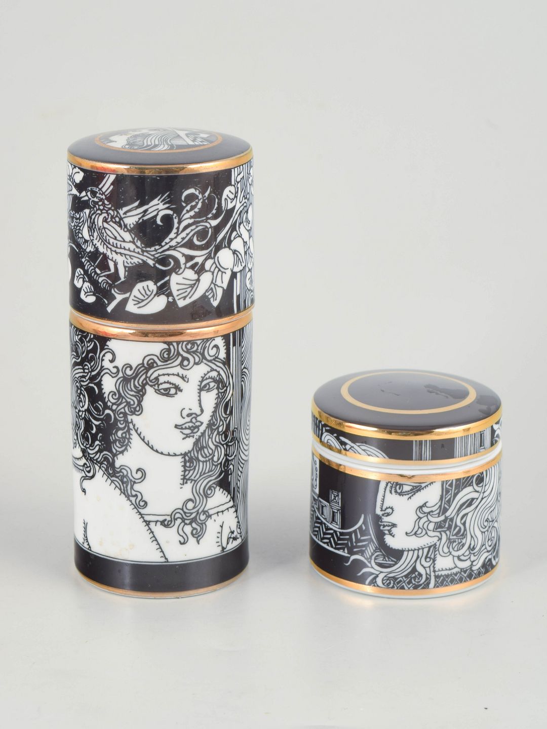 Hollóháza Porcelain Manufactory, 2 lidded jars.Two cylindrical porcelain lidded jars with black and white graphic decoration and gilt details. Produced as a limited edition.