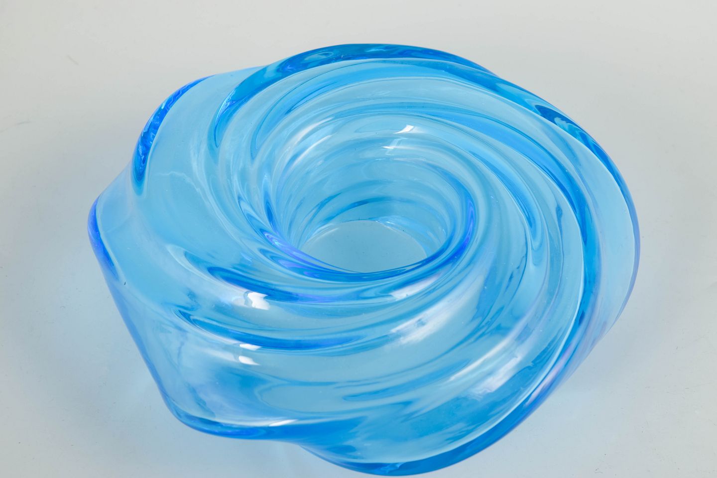 Vistosi atelier, Murano art glass bowl.Sculptural bowl in clear blue mouth-blown glass with a dynamic spiral form and flowing contours.