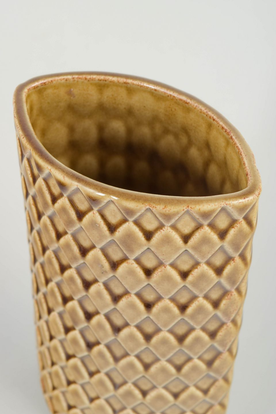 Kaarina Aho for Arabia, Harlekiini vase.Cylindrical ceramic vase with a relief patterned Harlekiini surface and a warm yellow-brown glaze. The Harlekiini model is known for its tactile diamond relief that creates a lively interplay of light across the glazed surface.