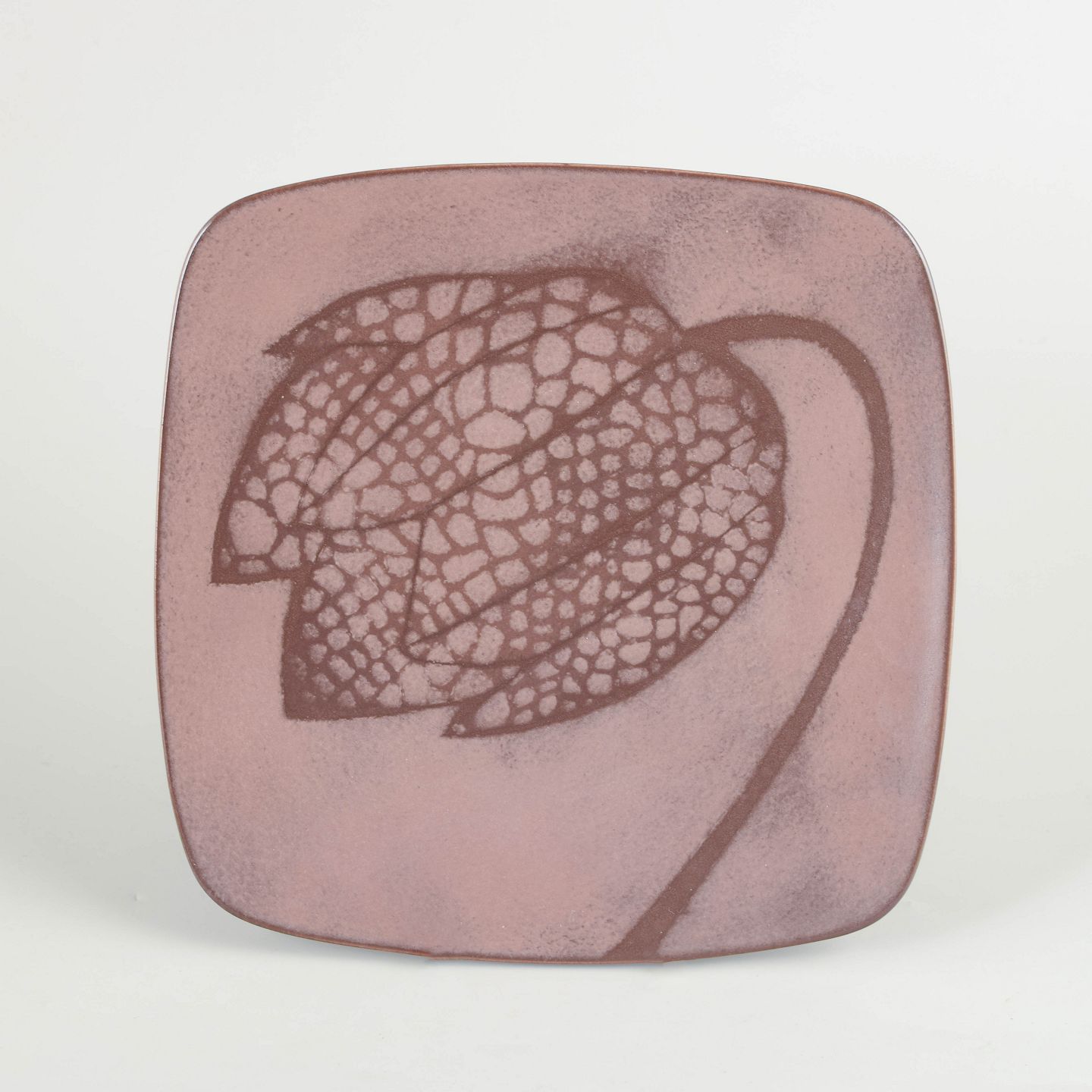 Ann Pentik for Pentik Studio, unique dish.Square stoneware dish with a subdued pink glaze and a stylised leaf motif in darker tones. Signed Ann Pentik on the base. Unique work from Pentik Studio.