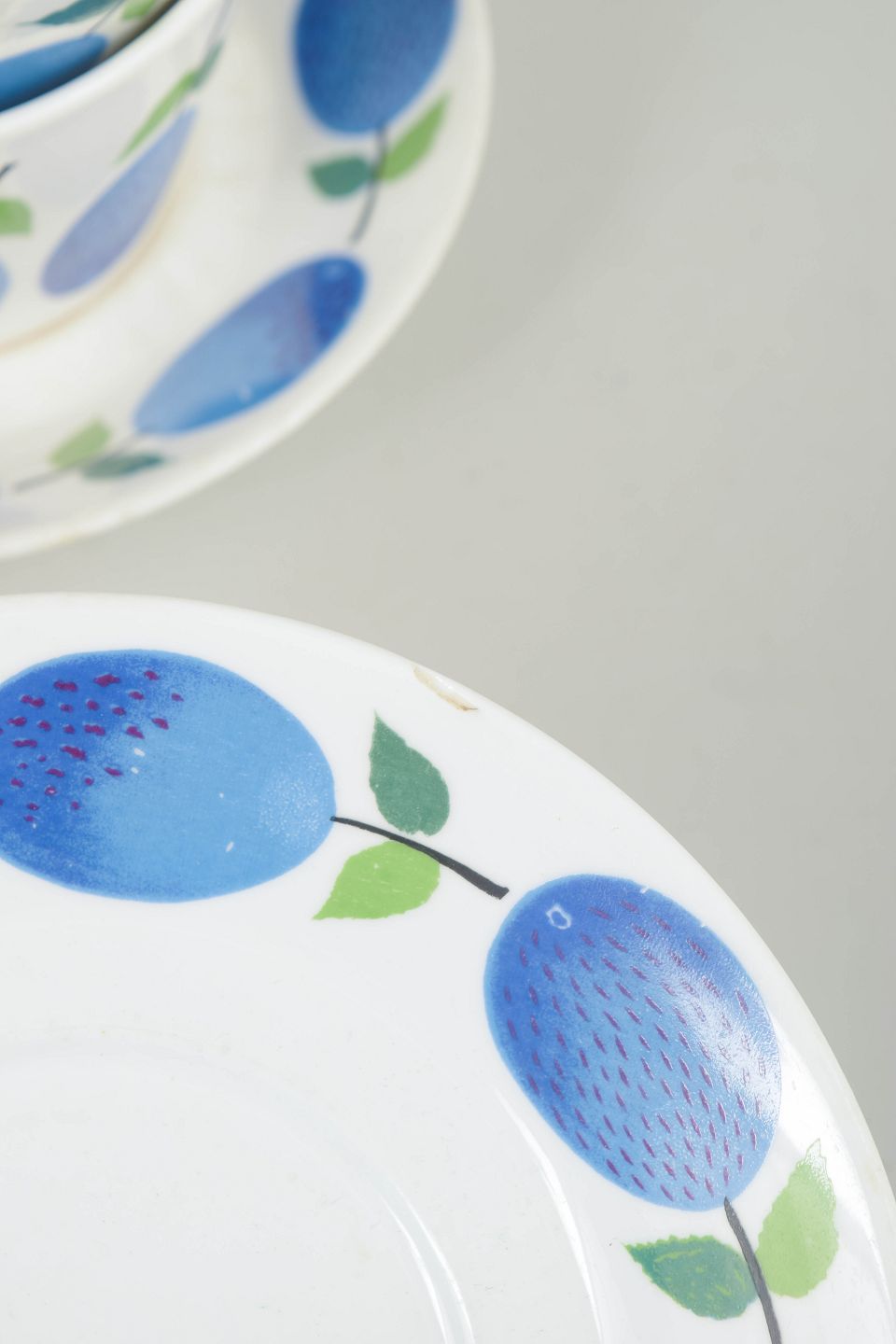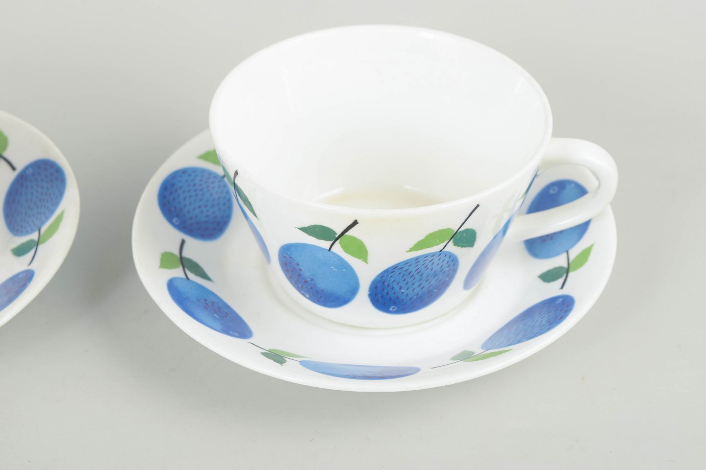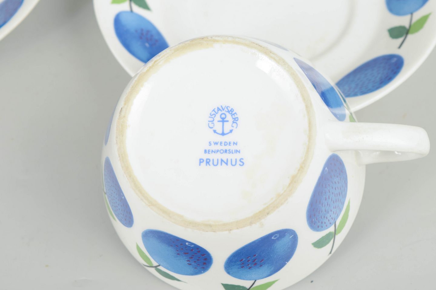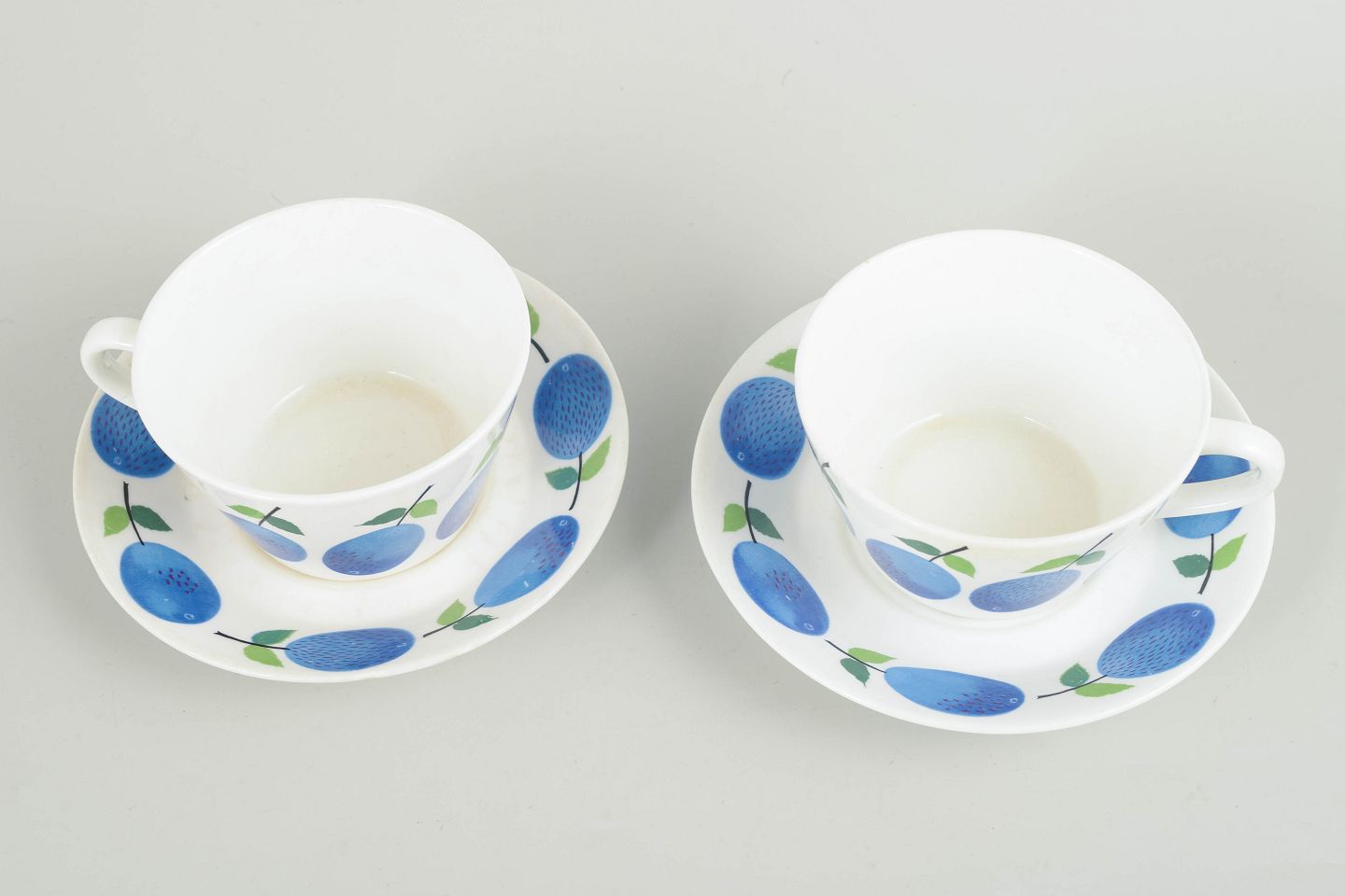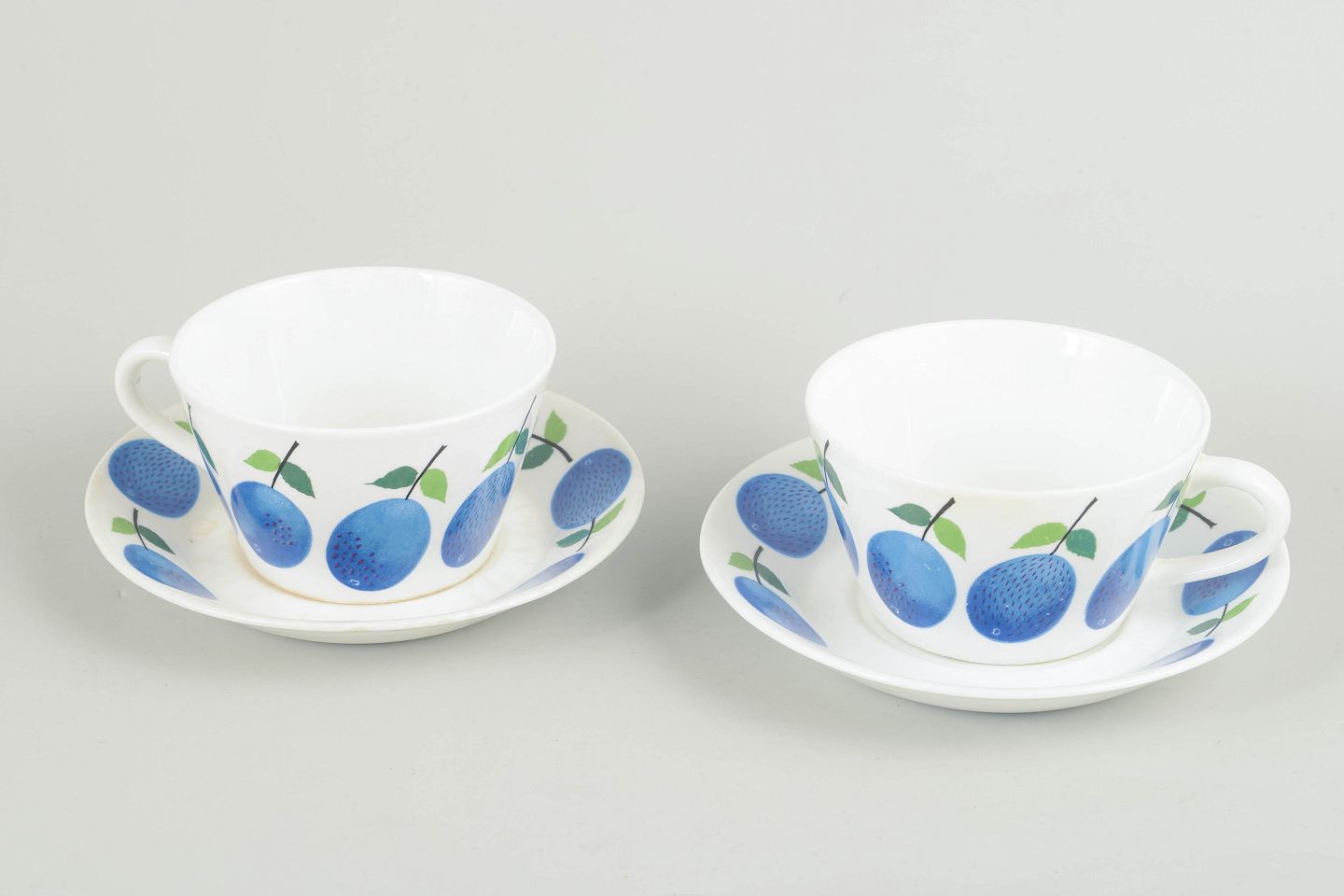 Stig Lindberg for Gustavsberg – “Prunus” teacups with matching saucers.Set of two faience teacups with matching saucers, decorated with the characteristic Prunus pattern in blue and green tones.