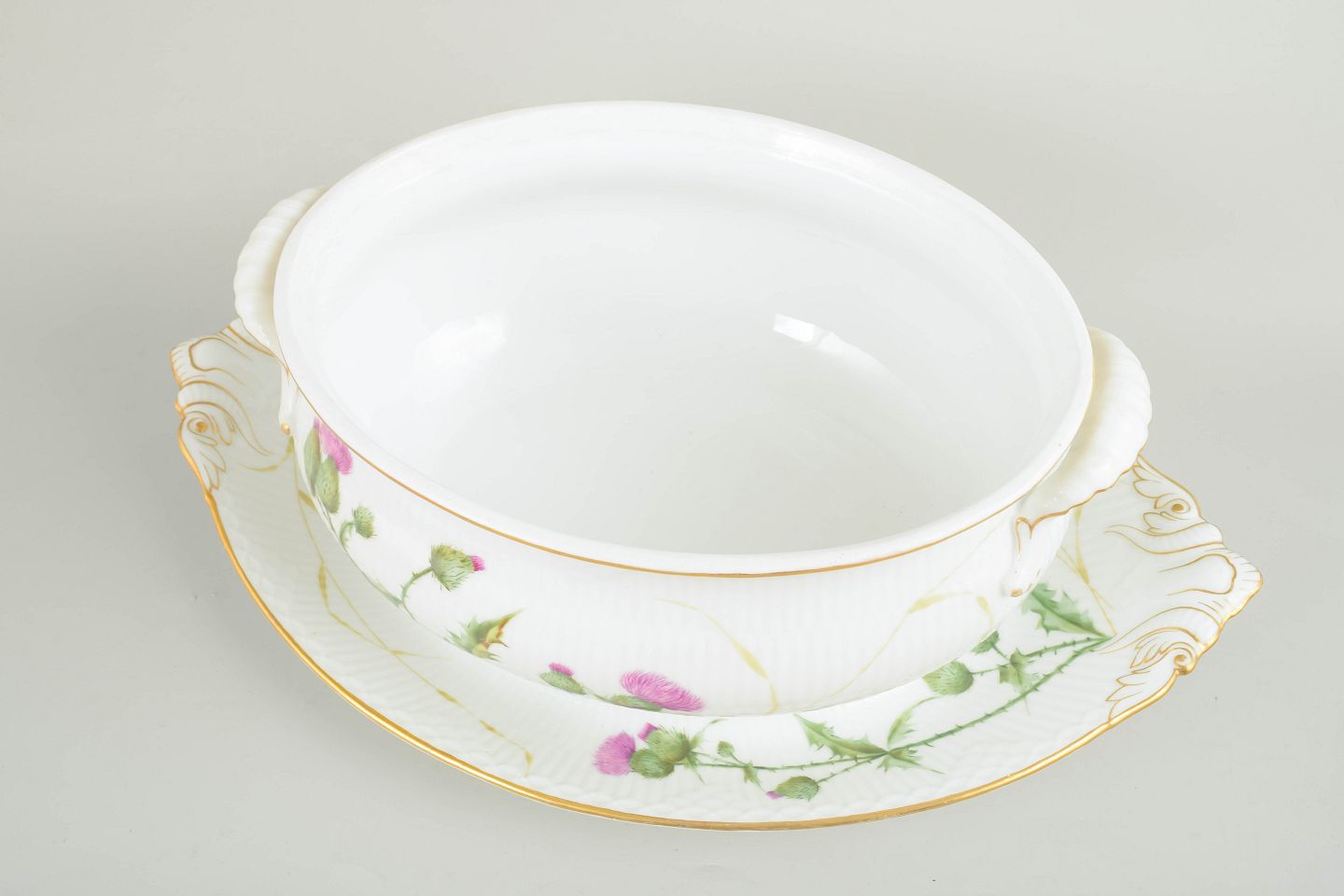 Royal Copenhagen, antique large soup tureen with stand.Large hand-painted porcelain soup tureen with matching stand, decorated with a naturalistic thistle motif and refined gilded details. Executed to a very high standard of craftsmanship, characteristic of Royal Copenhagen’s prestigious serving pieces of the 19th century.