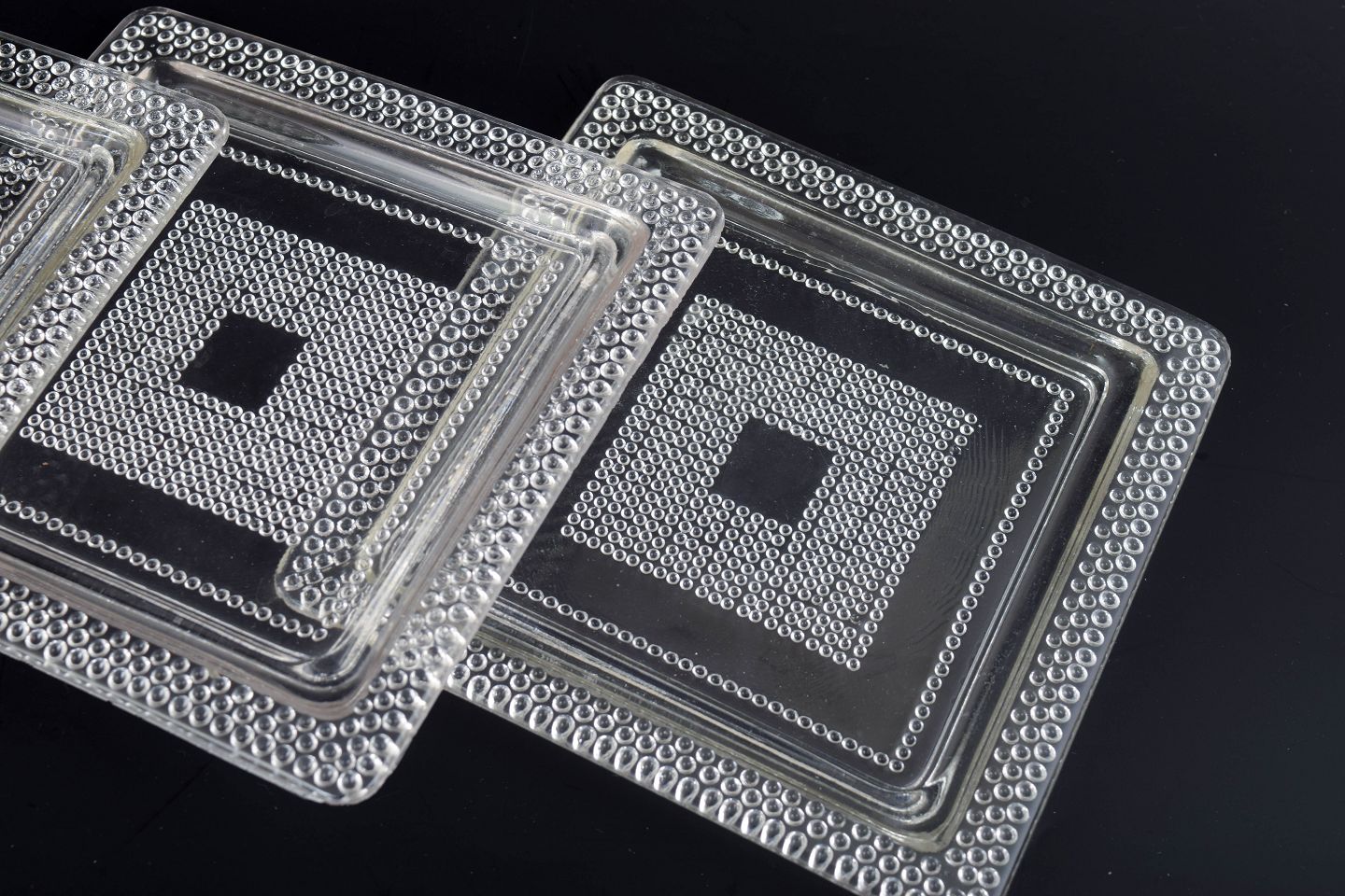 Set of three square plates in clear art glass with geometric relief and a defined central field. Pressed glass.