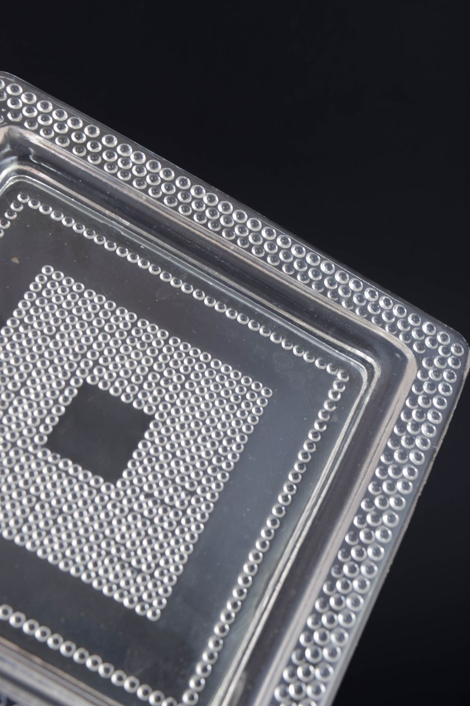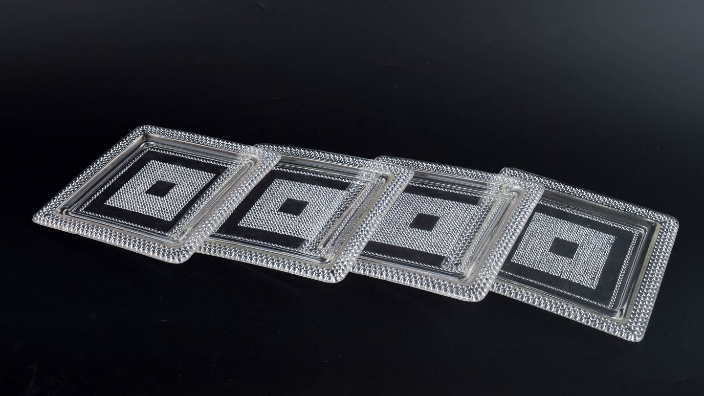 Oiva Toikka for Nuutajärvi, set of 4 plates.Set of four square plates in clear art glass with geometric relief and a defined central field. Pressed glass.