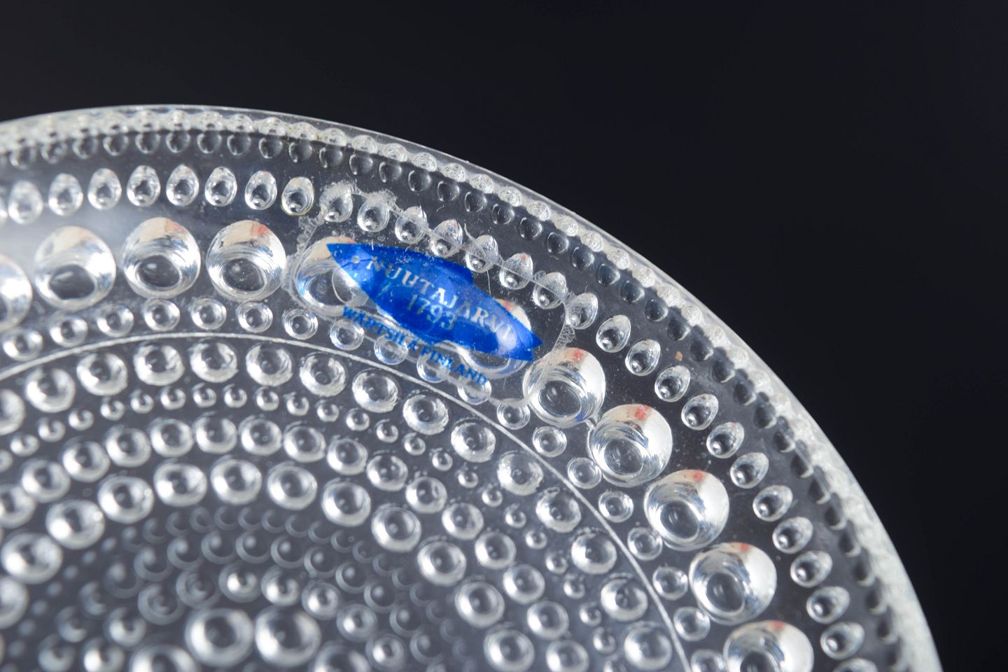 Oiva Toikka for Nuutajärvi, set of 4 bottle trays.Set of four small trays in clear art glass with dense relief of circular knop patterns. Pressed glass. Original Nuutajärvi label present on one example.