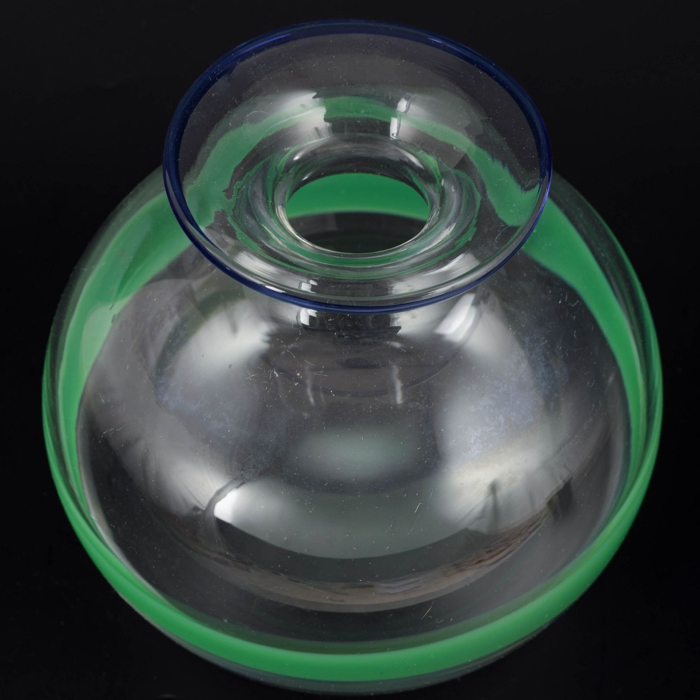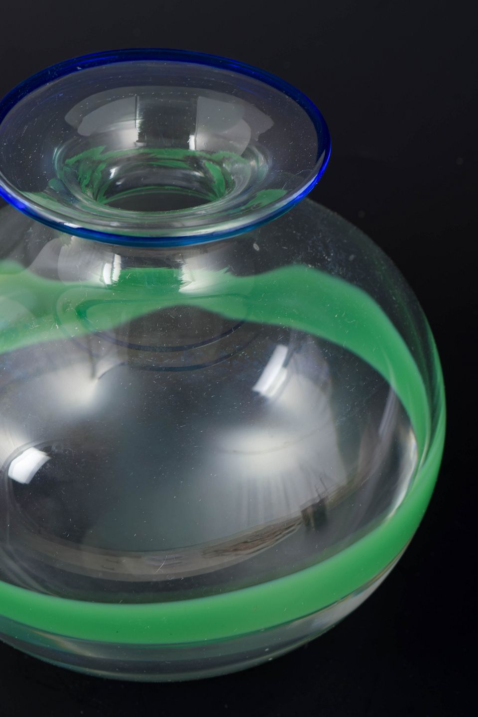 Blown art glass vase in clear glass with a broad green horizontal band and a blue accented rim. Model 42237.