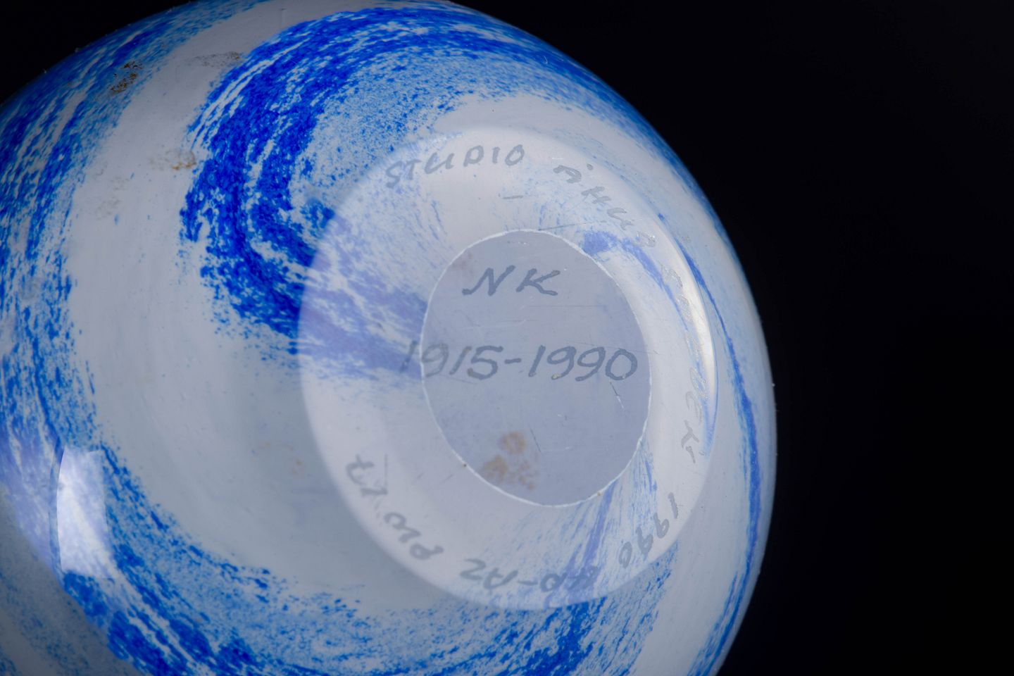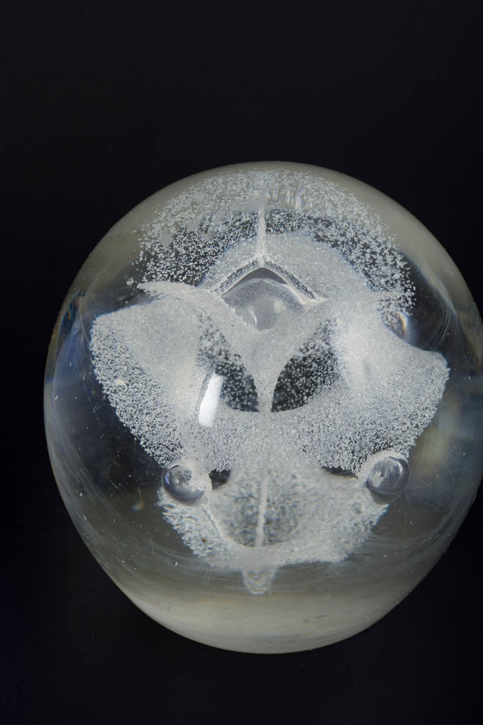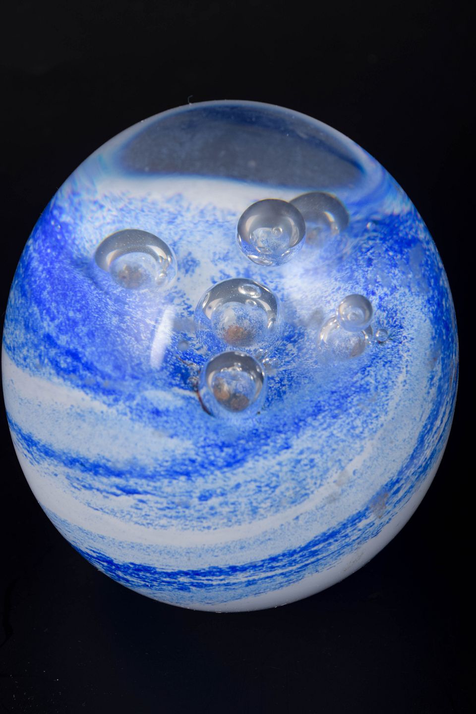 Åhus and others, paperweights.Organically shaped paperweight in clear art glass with internal blue and white veils and encapsulated air bubbles. Signed to the base “Studio Åhus, NK 1915–1990”.