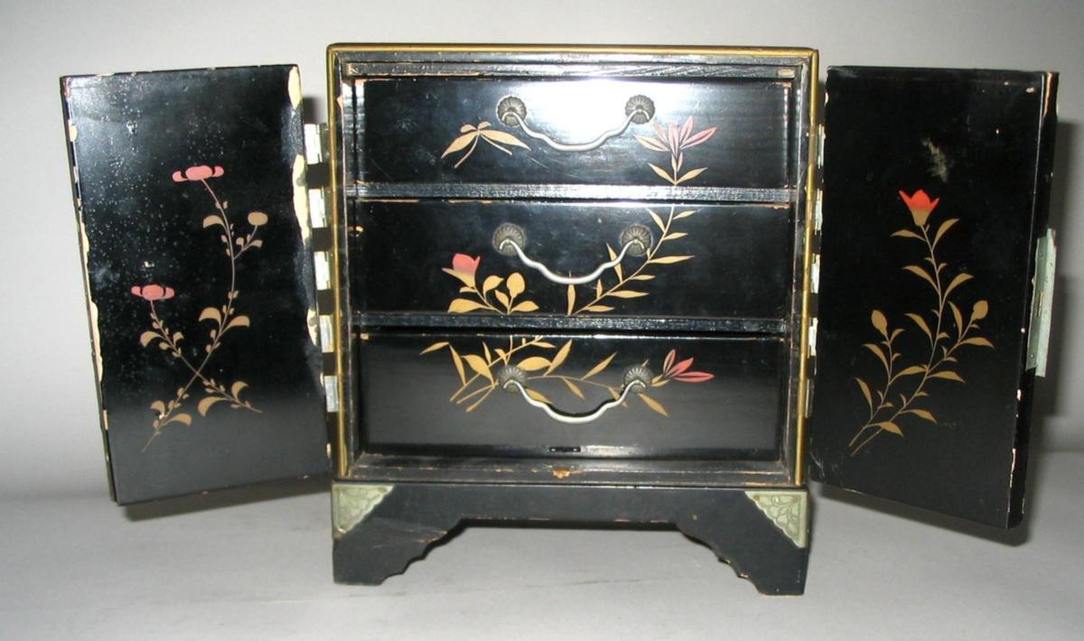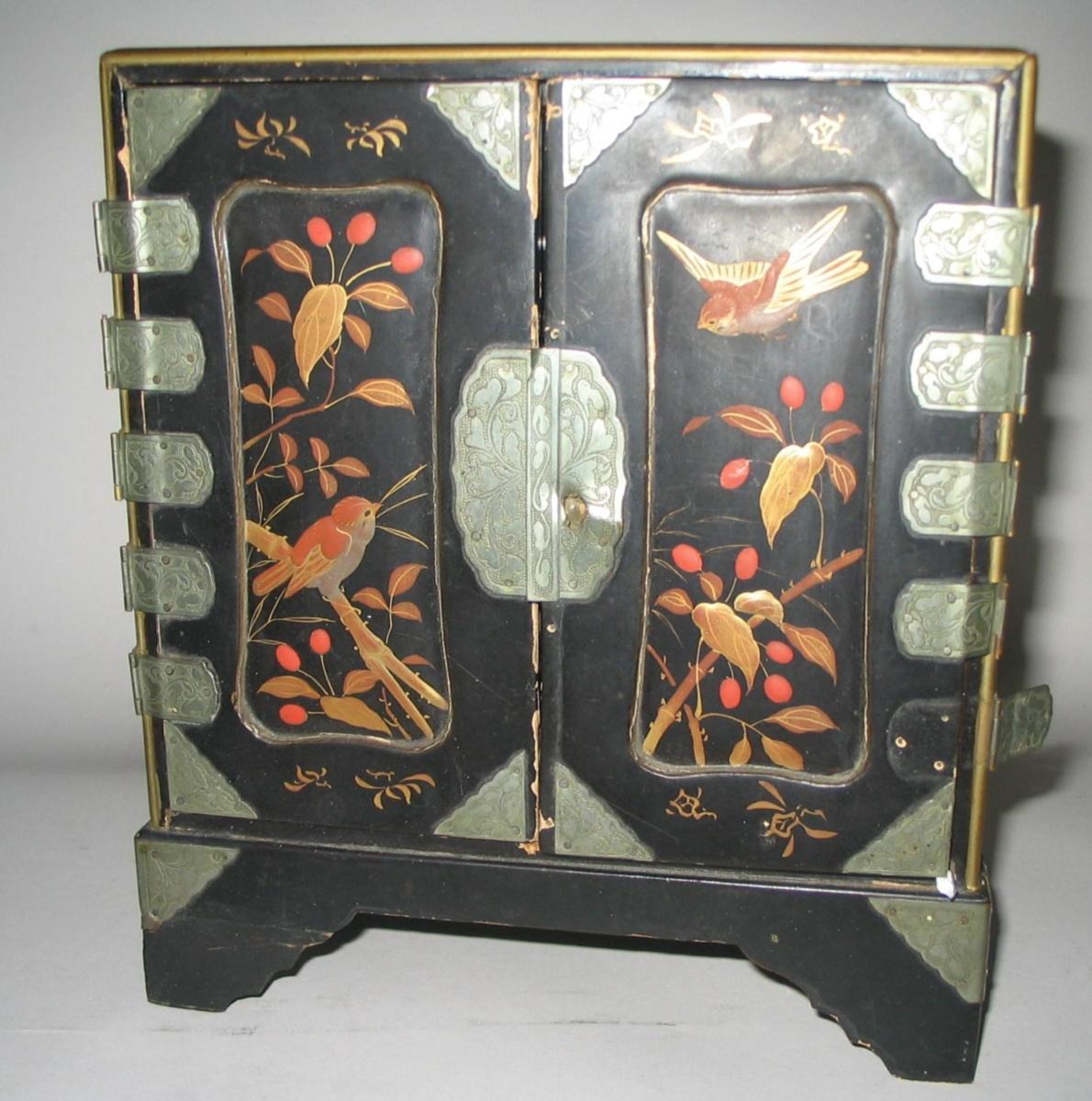 Chinese jewelry box in lacquer work with decorations in the form of birds on branches with berries. With two doors; inside with three drawers - also with decorations. H.: 21 cm. D: 11 cm. W.: 19 cm. With a few chips.Item number: 1504