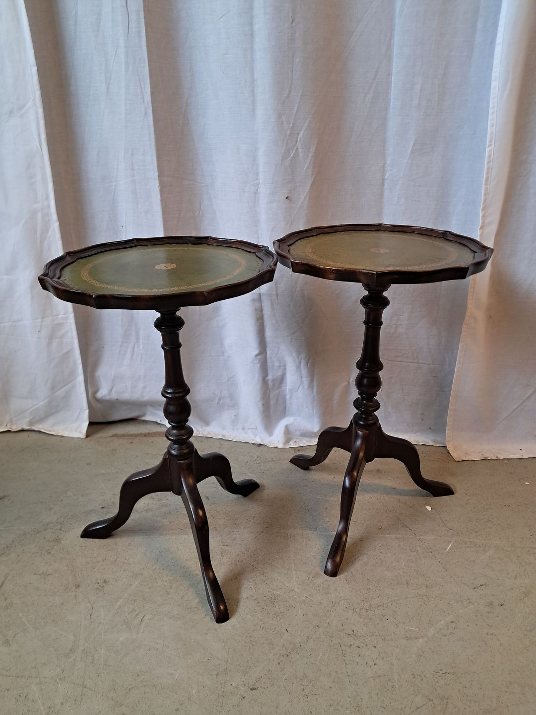 2 Pynteborde i bøgetræ med kunst læder indlæg, fra 1990erne.De har brugsspor.